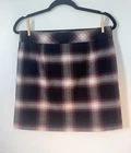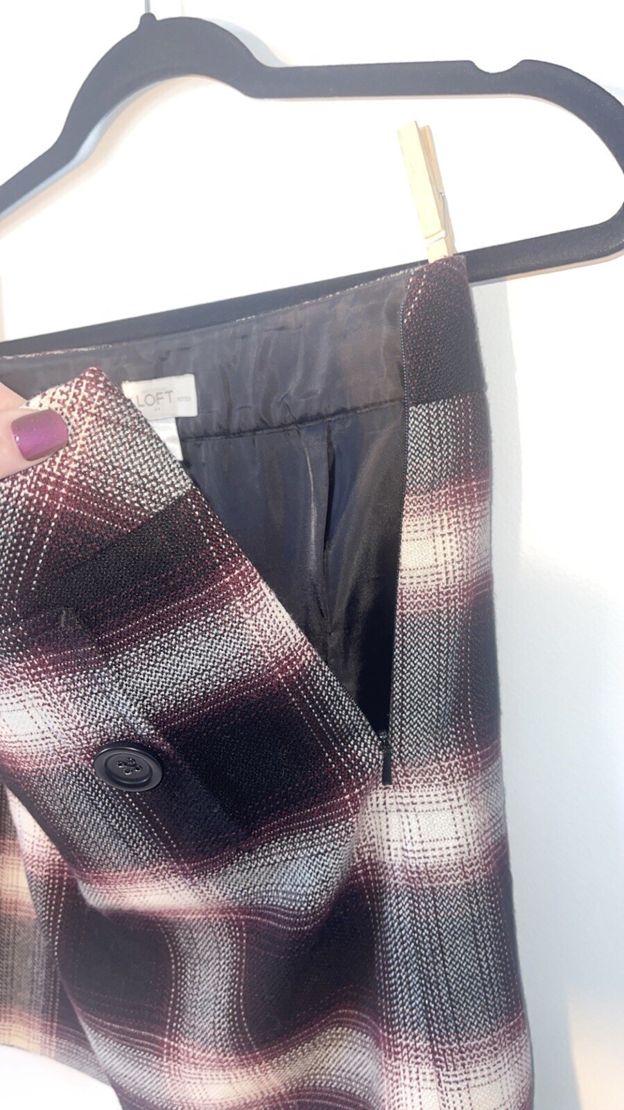 Womens Ann Taylor Loft skirt size 6P Petite A short straight skirt with the slightest flare A solid black and white plaid pattern with a dark maroon purple teased throughout A side zip closure, with a clasp at the waistline No material tag in the skirt, a nice lightweight material with a smooth black lining on the inside Decorative pocket with button on either side on the front, just accents as they do not function A preowned item in good condition shows slight wear but no noticeable flaws Comes cleanly, packaged well, free of pet hair and smoke smell