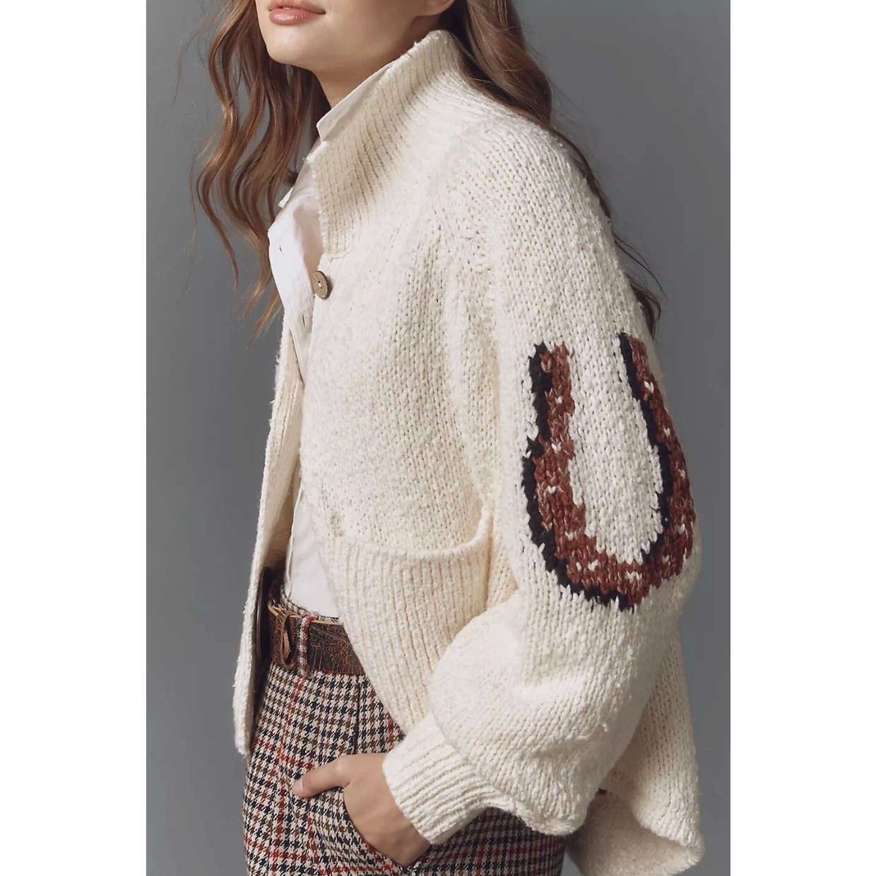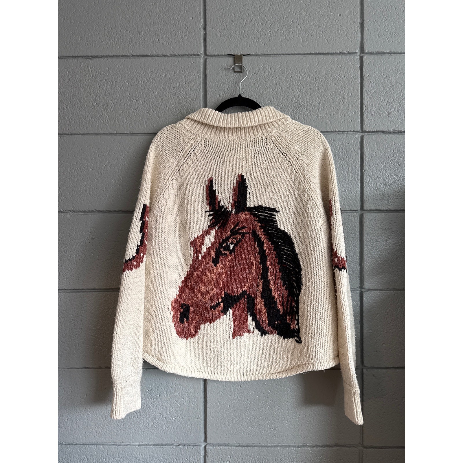 Womens Anthropologie Pilcro Western Horse Cardigan Sweater Equestrian Cream sz L Has sweater weather ever looked (and felt) this good? This cardigan showcases a whimsical horse graphic, combining cozy comfort with a playful Western-inspired design that's perfect for casual outings. to note: there is a small spot on the inside collar as pictured. Otherwise excellent cozy condition and ready for a new home. Not noticeable when wearing. materials: 63% cotton, 31% acrylic, 6% nylon measurements: pit to pit: 25.5” length: 24”