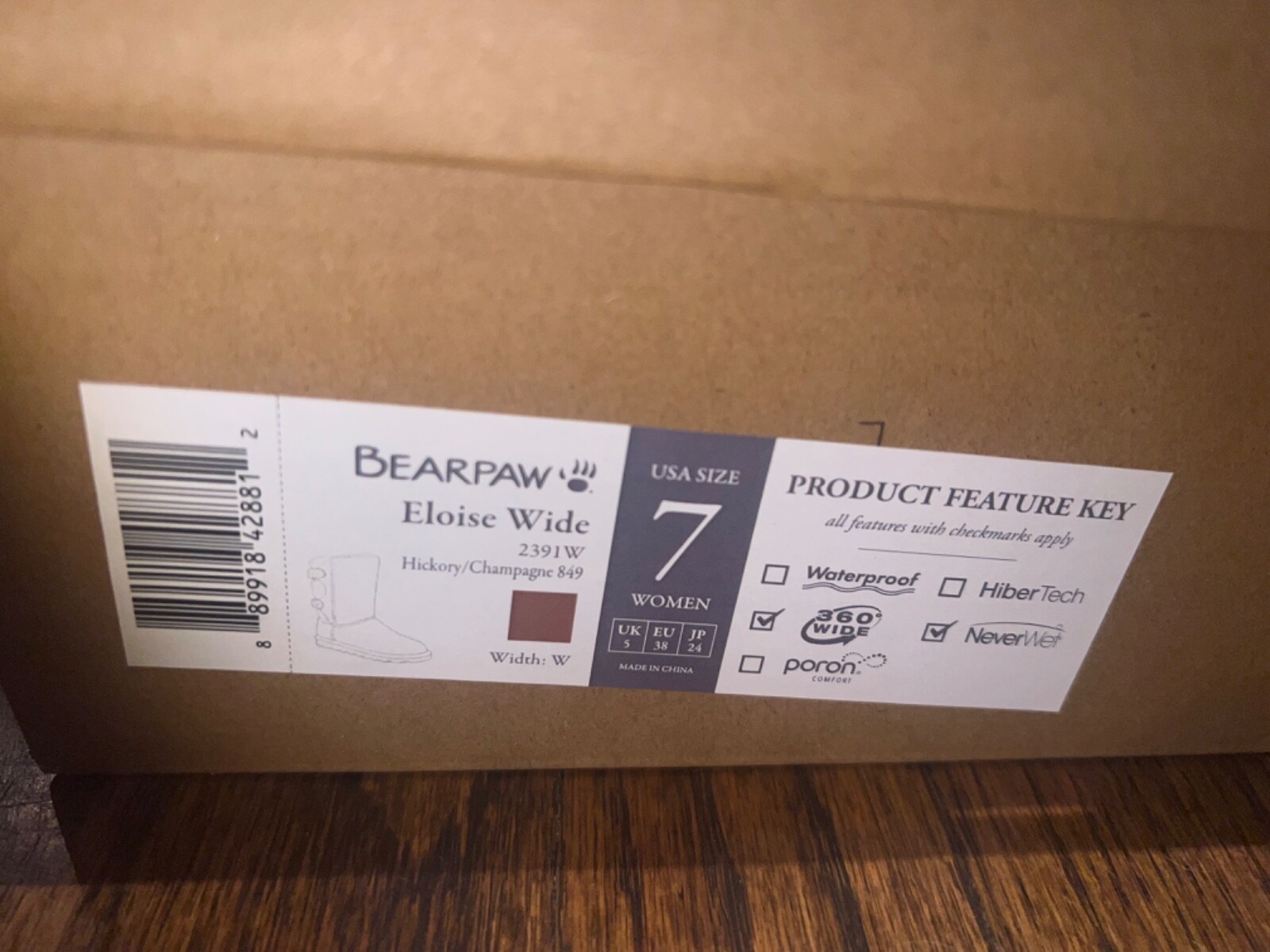 Brand new in original box! Size: Women's Size 7 Wide Width Color: Hickory/Champagne Double d-ring straps cinch the back of this smart suede boot on BearPaw's new slimmer design construction with fuzzy faux fur or wool blend accented back panel. Treated with BearCoat™ Rain & Stain Repellent. Features: -Suede, faux fur upper -Decorate buckle details -Pull-on, Buckle -Wool blend lining -Comfort sheepskin footbed -Lightweight blown rubber outsole -Treated with BearCoat™ Rain & Stain Repellent -8" shaft height -13" circumference