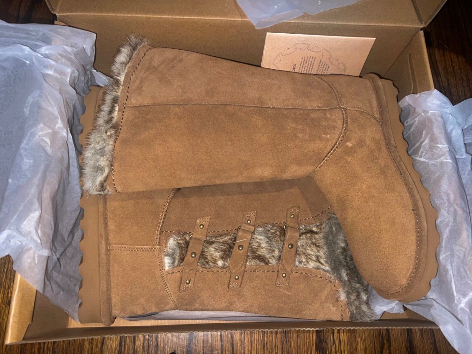 Brand new in original box! Size: Women's Size 7 Medium Width Color: Hickory (Color: II 220) Make a statement with this cozy, free-spirited 11 inch tall boot. Adorned with three decorative strap detail and faux fur collar accent. Treated with BearCoat™ Rain & Stain Repellent for extra protection from the elements. Features: -Suede upper -Faux fur collar -Decorative strap details -Faux fur and wool blend lining -Removable comfort sheepskin footbed -Lightweight blown rubber outsole -Treated with BearCoat™ Rain & Stain Repellent -11" shaft height -12" circumference -0.75'' heel height
