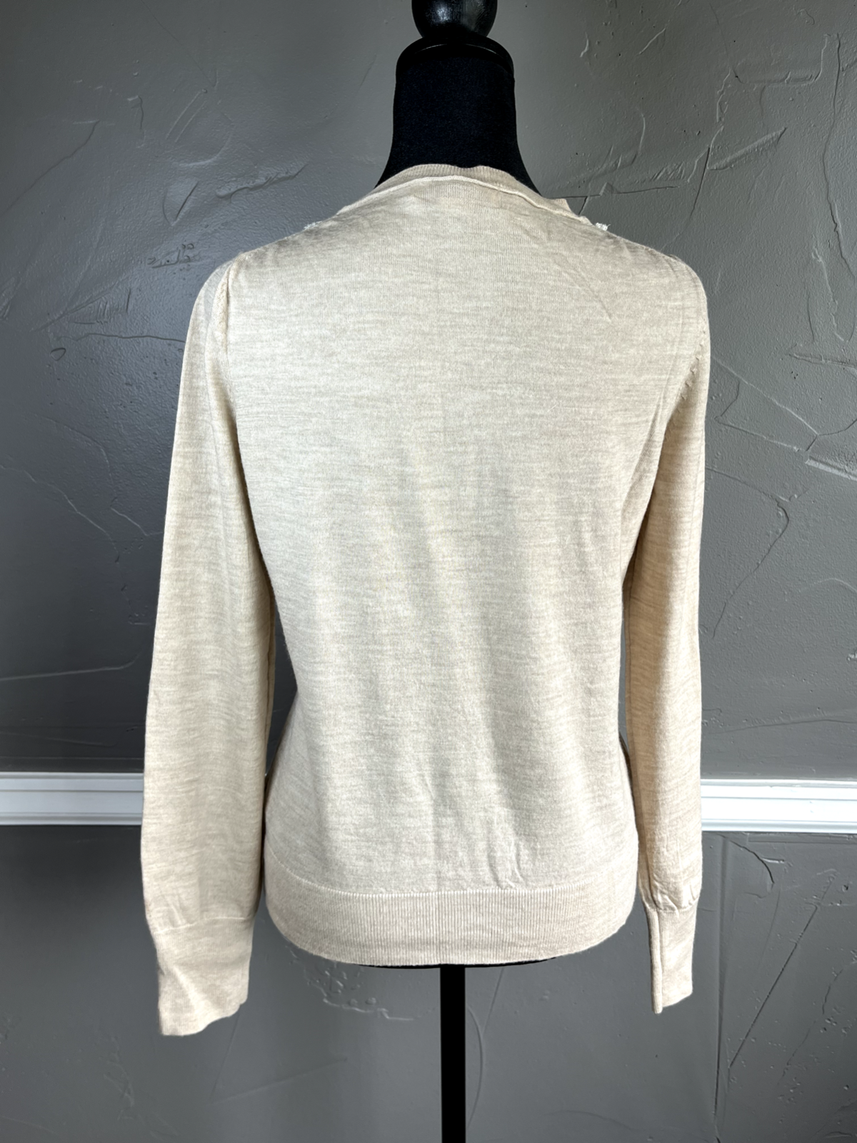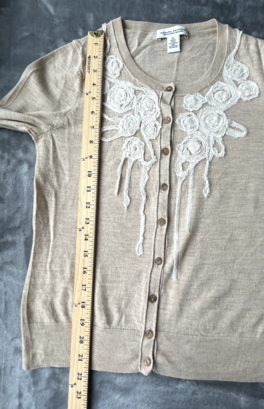 Banana Republic Women's Beige Extra Fine Merino Lightweight Cardigan Please check measurement in photos as sizes vary Size: M Color: Beige Good Used Condition Fabric: 100% Extra Fine Merino Wool Machine Wash Cold Comes from smoke free home