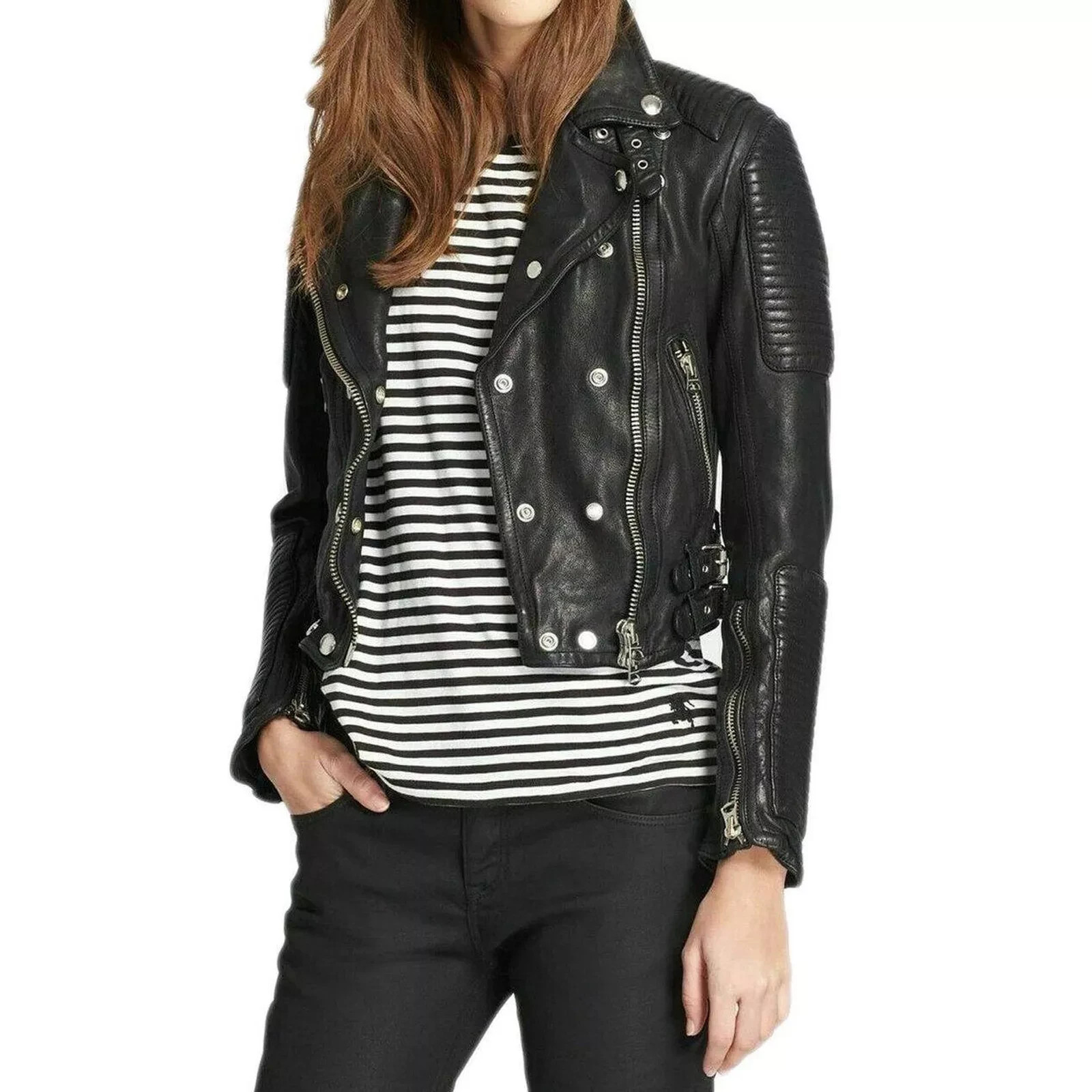 Women’s Genuine Lambskin Leather Motorcycle Jacket – Slim Fit Designer Biker Style Item Description This Women’s Genuine Lambskin Leather Biker Jacket is crafted for those who love premium quality, a sleek silhouette, and a bold motorcycle look. Designed with attention to detail and stitched to perfection, this jacket delivers both luxury and everyday comfort. PRODUCT DETAILS Premium Quality Material: Genuine Lambskin Leather & Synthetic Leather Lightweight & Comfortable — Ideal for all seasons Stylish Outer & Inner Pockets Expertly Crafted with Attention to Detail Soft Polyester Lining for added comfort Durable Double Stitching throughout Front Zip Closure Handmade : Professionally cut and stitched to international standards Brand New with Tags 100% MONEY BACK GUARANTEE!! IMPORTANT ADDITIONAL INFORMATION We have a USA address available for easy returns. We also have a USA-based agent you can meet for bulk or big wholesale deals . All items are shipped from Pakistan , and delivery normally takes 3–4 days using fast shipping services. We try our best to use tax-free services , but if taxes apply due to government tariffs, the buyer will be responsible . SHIPMENT POLICY Delivery usually takes 7–10 working days . If your required size is not available in US stock, it will be shipped directly from our overseas manufacturing unit in Pakistan —one of the world’s leading leather exporters (including the maker of FIFA World Cup 2014 footballs). Customs / Import duties (if applicable) will be paid by the buyer. RETURN & EXCHANGE POLICY If you change your mind or want to return the jacket, simply send it back within 14 days in unused, undamaged condition with original packaging. Once received, we will issue a full refund (excluding return postage). If your item arrives damaged , we will provide a return label and issue a replacement or full refund after receiving the item. FEEDBACK Your satisfaction means everything to us. If you face any issue, please contact us first before leaving negative or neutral feedback or opening any case. We promise to resolve any problem quickly — we want you to be happy and confident with your purchase. NOTE If the item is not available in our USA warehouse, we may ship it from our manufacturing units located in: UK Italy Pakistan