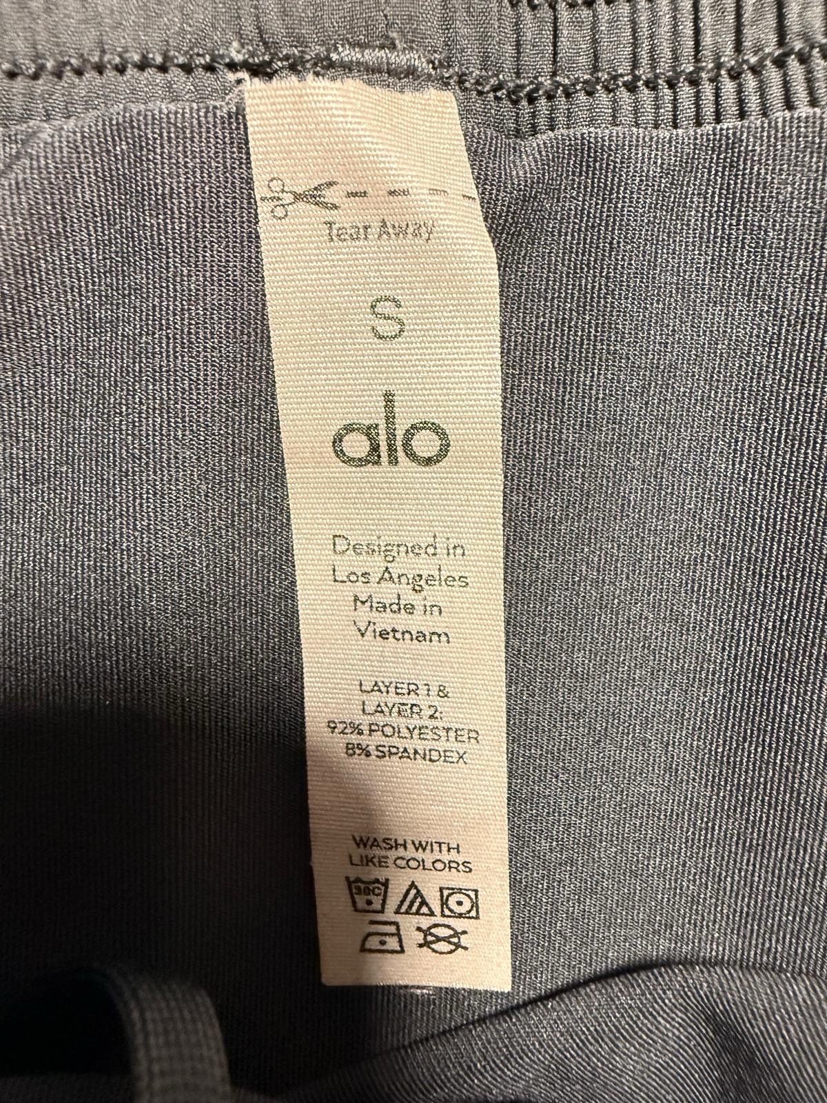 These women's black alo shorts in size small are perfect for active wear. They feature a solid pattern, drawstring closure, and pockets for convenience. Made for running and jogging in the spring and summer seasons, these athletic shorts by alo are machine washable and designed for the modern woman on the go. Size tag came off but will ship it out on the pocket side