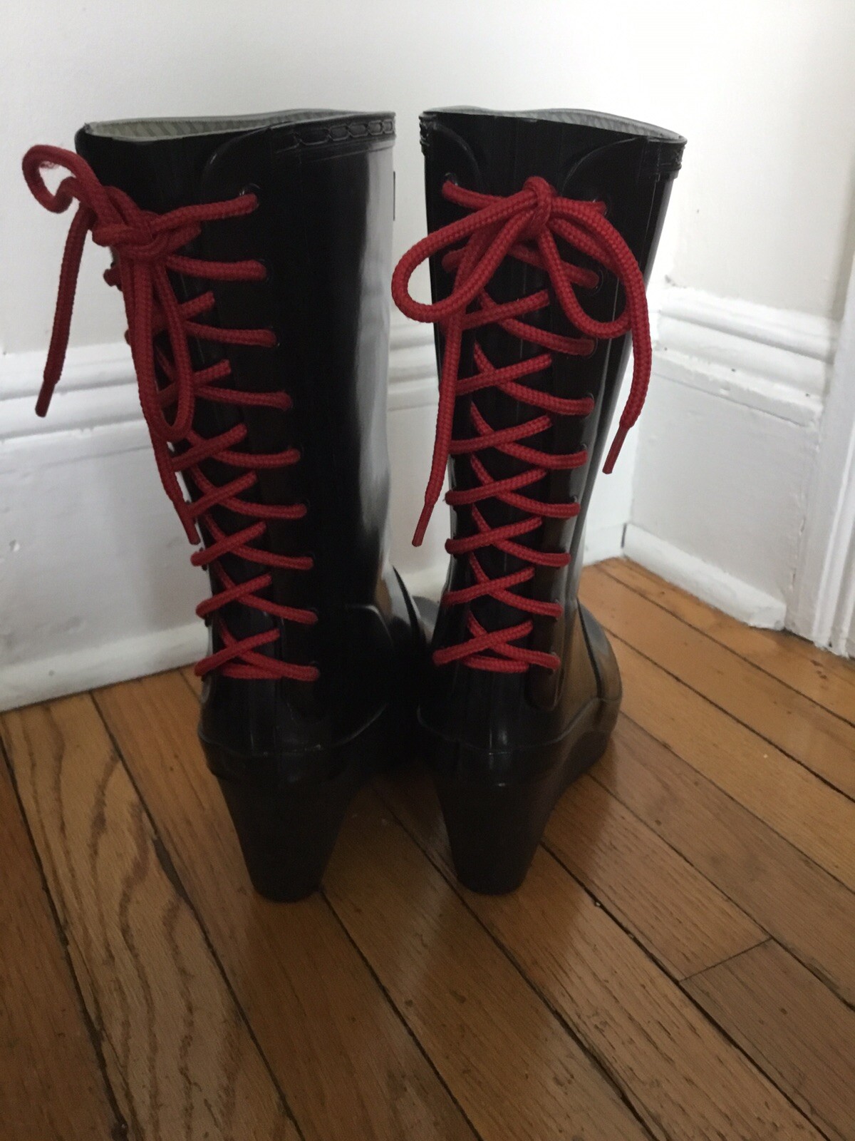 One of. Kind Hunter boots. Wedge heel with red laces also comes with interchangeable black laces. Comes with punch and care directions. Like new