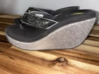 Shimmer with every step in these Volatile sandals. Sleek black design with sparkling accents. Ideal for casual outings. The Volatile Glimpse Women's Black Wedge Sandals in size 7 feature a stylish leather upper and a comfortable wedge heel design. These versatile sandals are perfect for everyday wear or dressy occasions, offering a sleek and fashionable look for any outfit. The brand's reputation for quality and the classic black color make these sandals a must-have addition to any woman's shoe collection. Nice condition Size 7