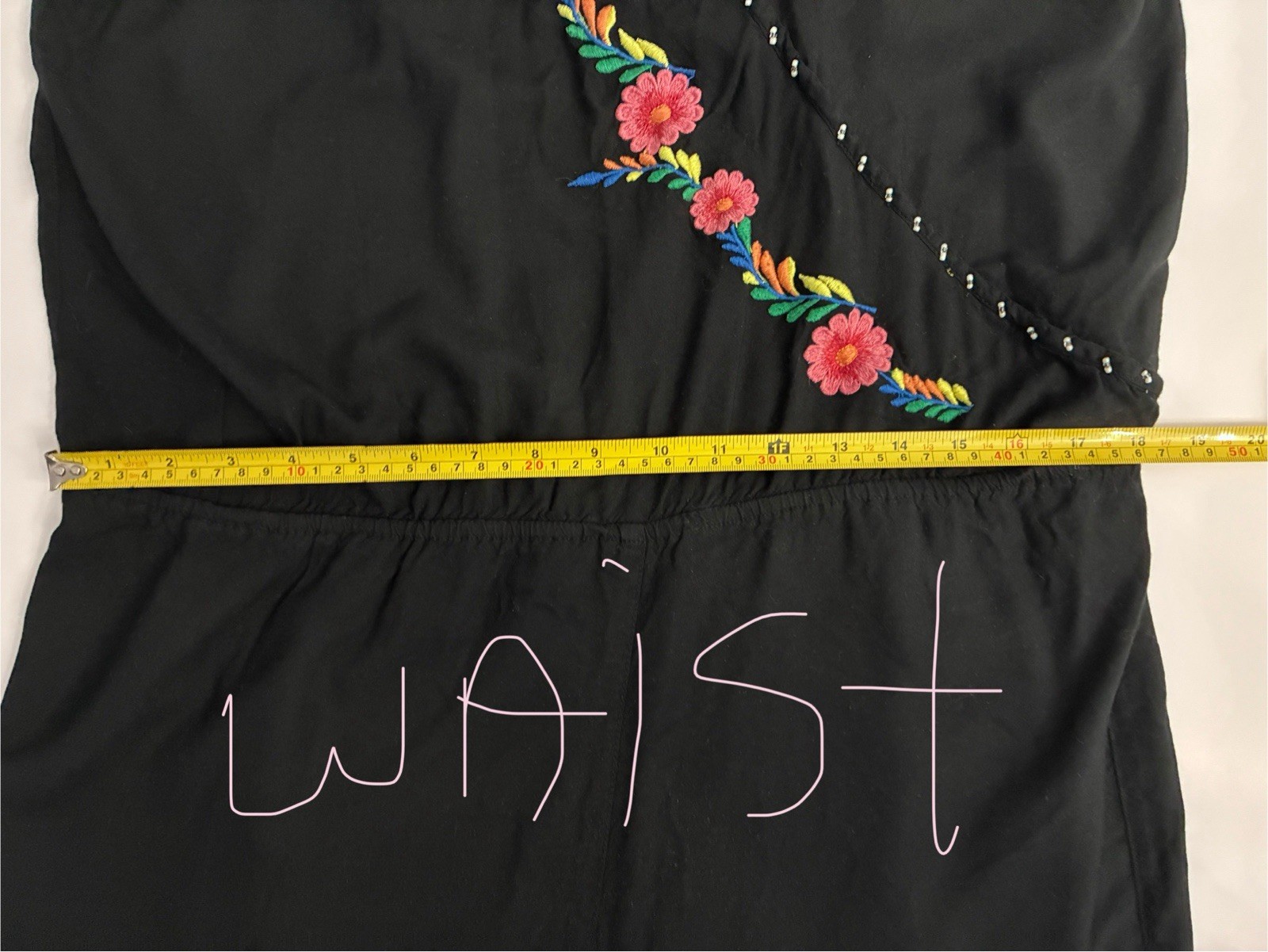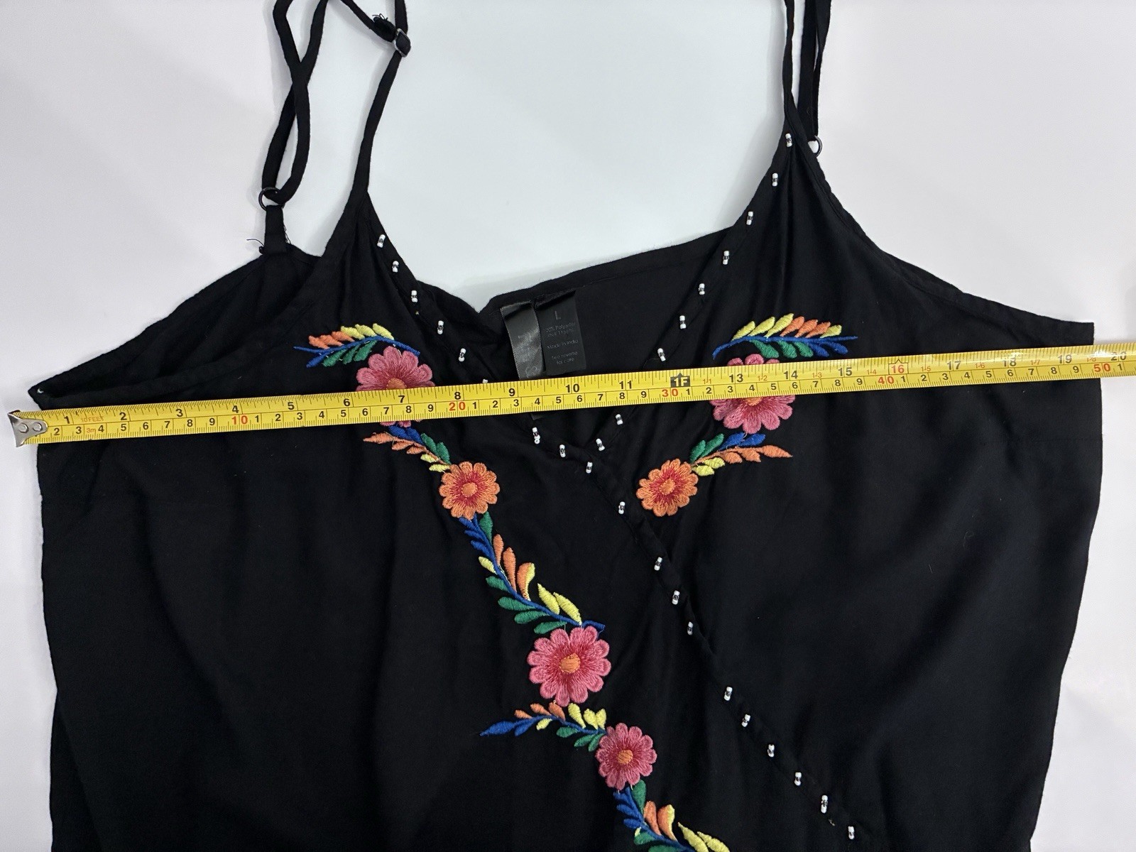 This product is a stylish black women's romper shorts in size Large, featuring a floral embroidered design with beaded accents. The romper has a V-neckline, strappy sleeves, and a hook & loop closure for a comfortable and relaxed fit. Perfect for travel or casual occasions during the summer and spring seasons, this machine washable romper from the brand Fun & Flirt is a vintage-inspired one-piece outfit with a flattering silhouette and breathable fabric. The set includes a pair of flared leg shorts and an elastic waist for added comfort and ease of movement. From smoke, free home fast shipping.