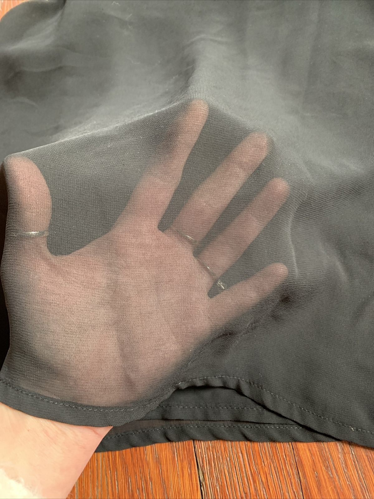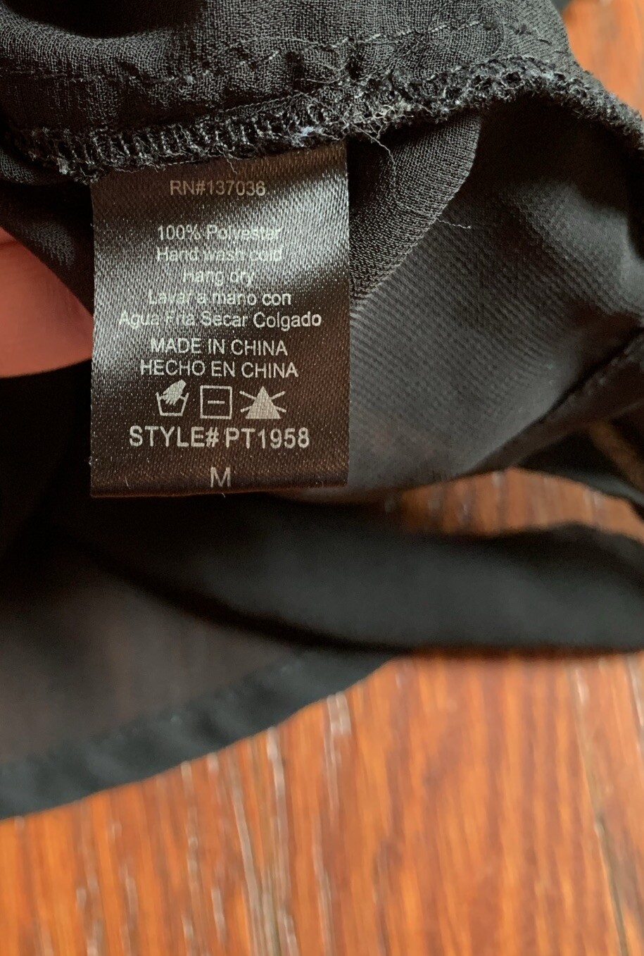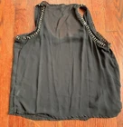 This is a stylish black tank top from the brand Paper Crane, featuring a sheer material with studded accents around both shoulders all the way around, (17” armpit to armpit), perfect for a grungy metal-inspired look. The top has a relaxed fit, sleeveless design with a boat neck neckline and a pullover closure. It is a size Medium, made of polyester, and suitable for occasions like dinner, a night out, or a concert. The edgy design of this top makes it a versatile piece that can be dressed up or down for various events.