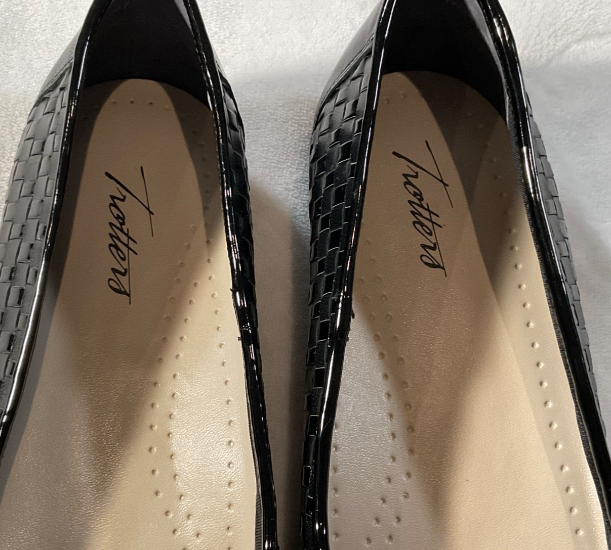 These women's black woven loafers by Trotters are designed for comfort with a slip-on closure and leather lining. The solid black color makes them versatile for casual occasions in the summer, fall, and spring seasons. Made with leather upper and insole materials, these flats offer a stylish and practical option for women looking for a loafers style shoe in size 8.5.