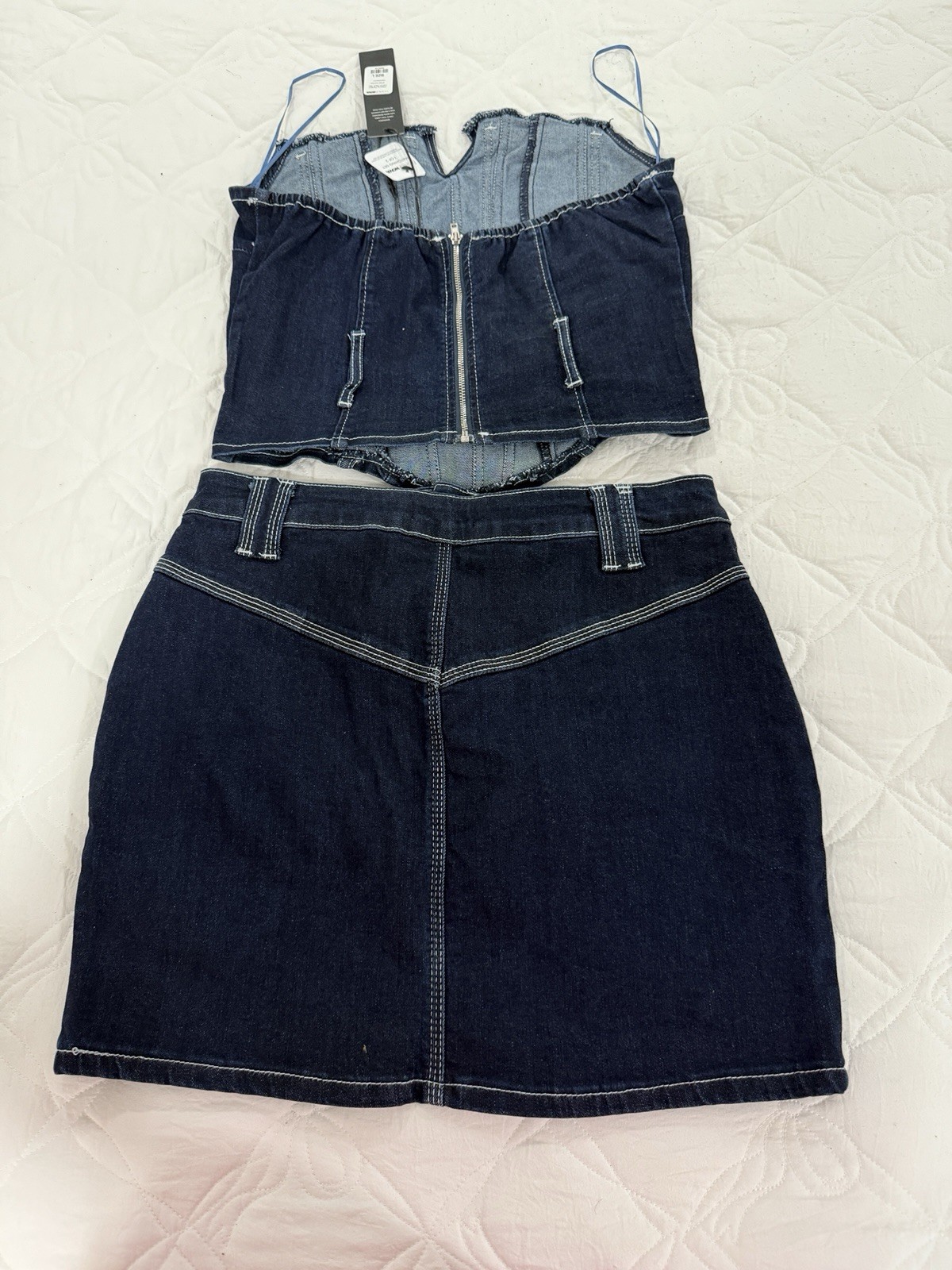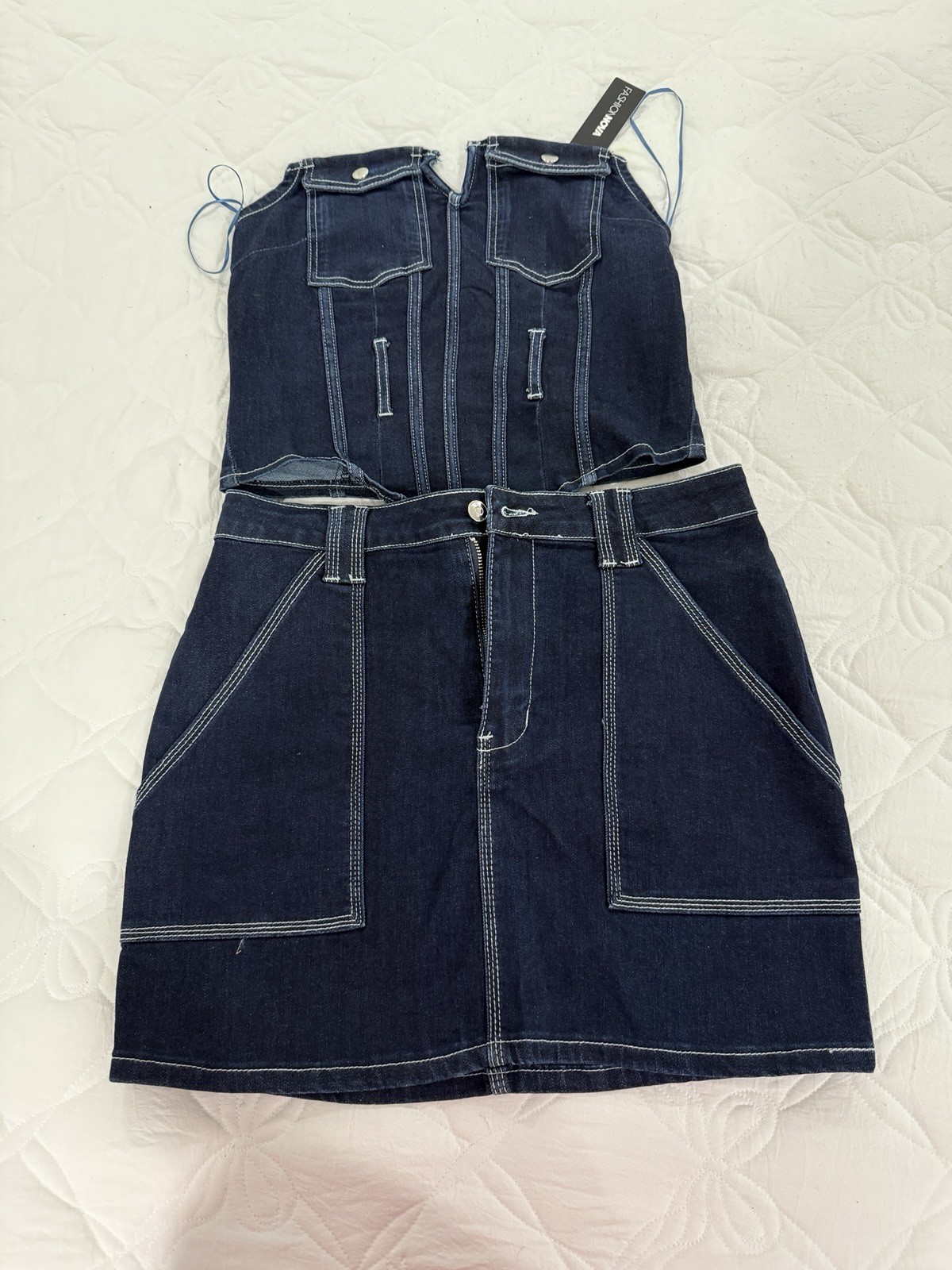 This Women's Blue Denim Cotton Skirt and Top 2 Piece Outfit in size L features a solid pattern with a zipper closure. The outfit is casual and made from cotton denim fabric, perfect for summer, fall, and spring. The skirt is a mini style with a mid rise and pockets, making it a stylish and comfortable choice for everyday wear. The Fashion Nova brand ensures quality and the new with tags detail confirms that this outfit is a fresh addition to any wardrobe.