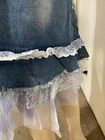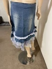 Women’s Blue Denim Cotton Casual Stretch Asymmetric Boho Hippie Vintage Ruffle Layered Lace Beaded Long Maxi Zipper Size L(8-10) Skirt 902 Waist 32” Hips 38” Length 27”
