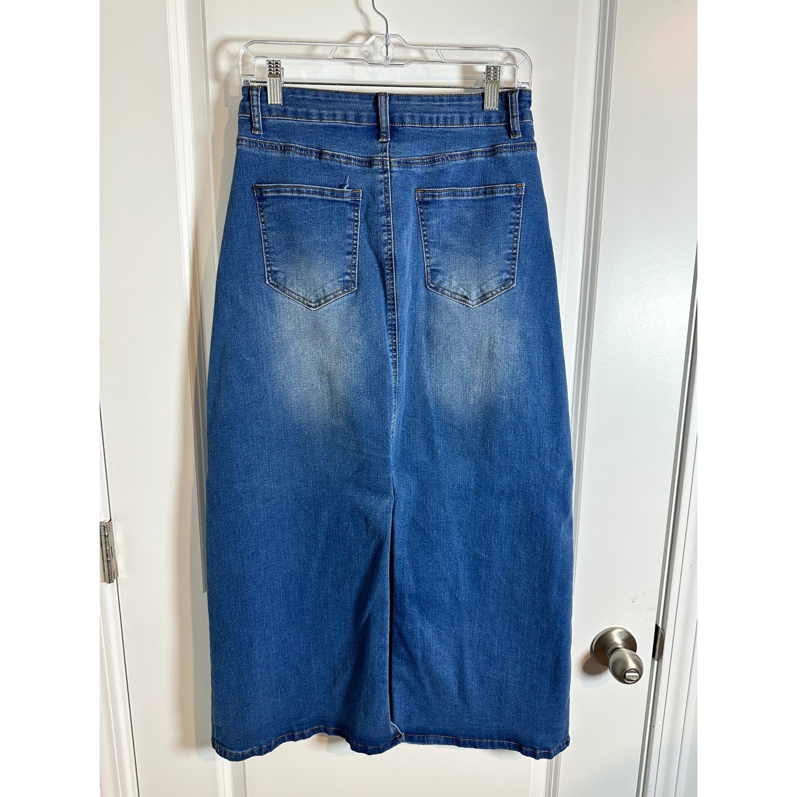 Step into effortless style with this captivating denim maxi skirt. The classic blue wash evokes a sense of timeless appeal, while the streamlined silhouette elegantly drapes to a modest length. This skirt is designed to flatter the figure and provide comfortable movement. Perfect for a sunny brunch with friends, a casual office setting, or a relaxed weekend getaway. Type: Skirt Style: Maxi Skirt Length: Long Color: Blue Department: Women Pattern: Solid Material: Denim, Cotton, Polyester, Spandex Accents: Button Fabric Type: Denim Features: Stretch, Pockets, Slit Character: Casual Chic, Denim Dreams, Modern Classic, Boho Vibes, Everyday Style Closure: Button Rise: High Keywords: denim maxi skirt, long denim skirt, jean skirt, womens skirt, casual skirt, blue skirt, size 8, denim clothing, maxi skirt, modest skirt, classic denim, contemporary fashion, streetwear, everyday wear