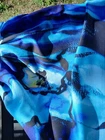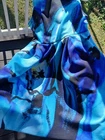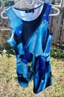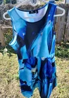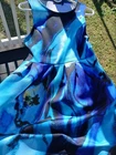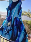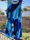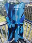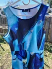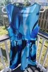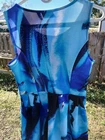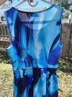 This is an Apt. 9 women's dress in size 8. It features an abstract floral pattern in blue, sleeveless design, and a fit & flare style. The dress is suitable for various occasions like travel, parties, casual wear, or business settings. It has pockets and a short length, making it a versatile and practical choice for a semi-formal look.