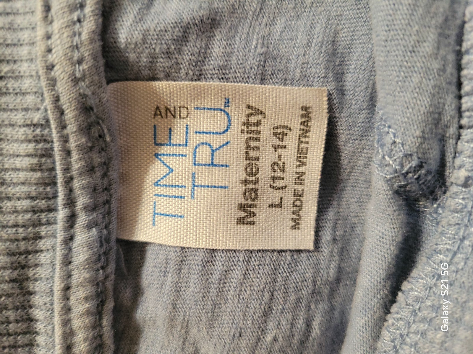 This women's maternity blouse is a relaxed fit, featuring a solid blue color with a round neckline and long casual sleeves. Made from a comfortable cotton blend material, it is designed for easy care and lightweight wear. The blouse is adorned with subtle accents and is suitable for everyday wear, embodying a basic style with a theme of love. The brand Time and Tru offers this blouse in size large, catering to the needs of expecting mothers seeking both comfort and style.