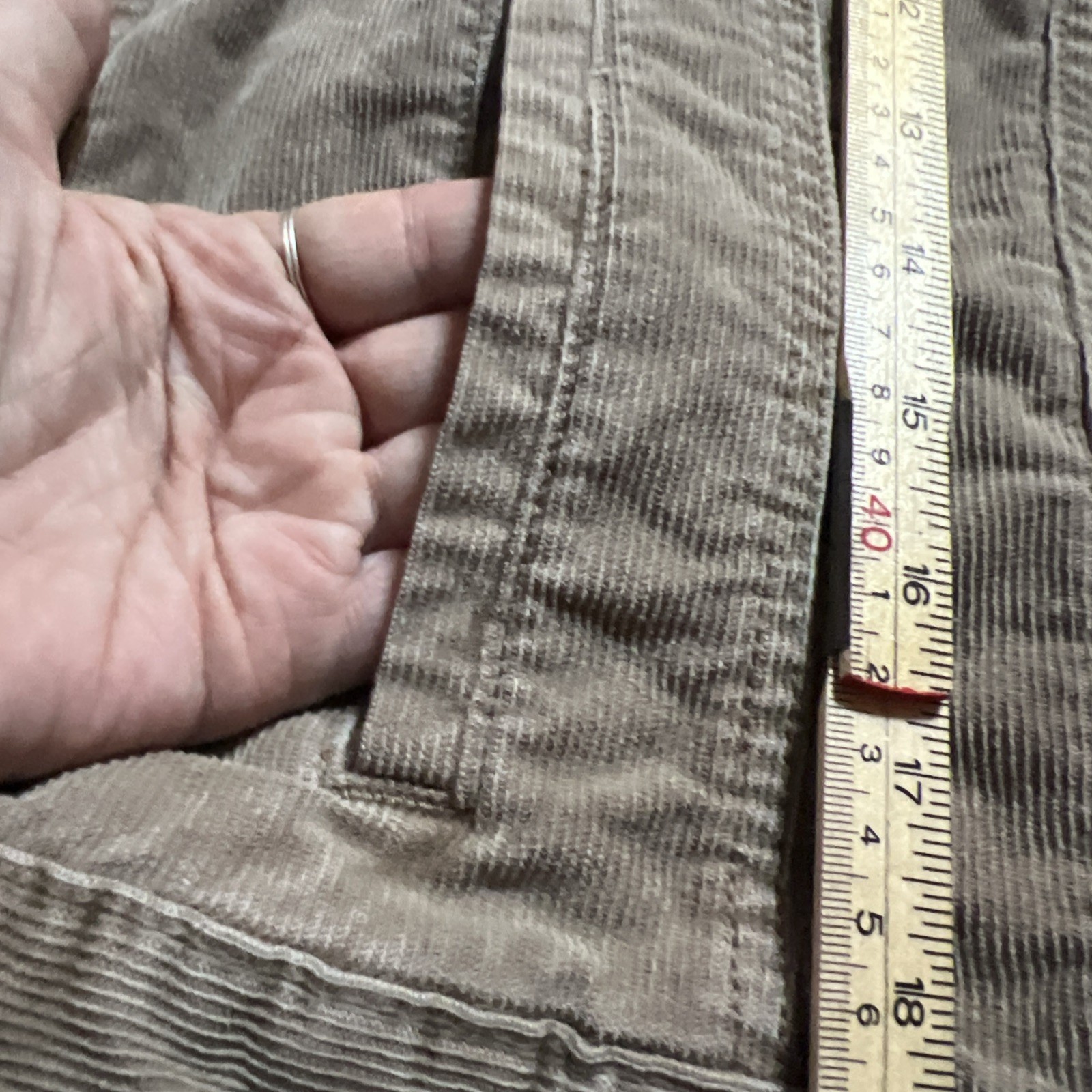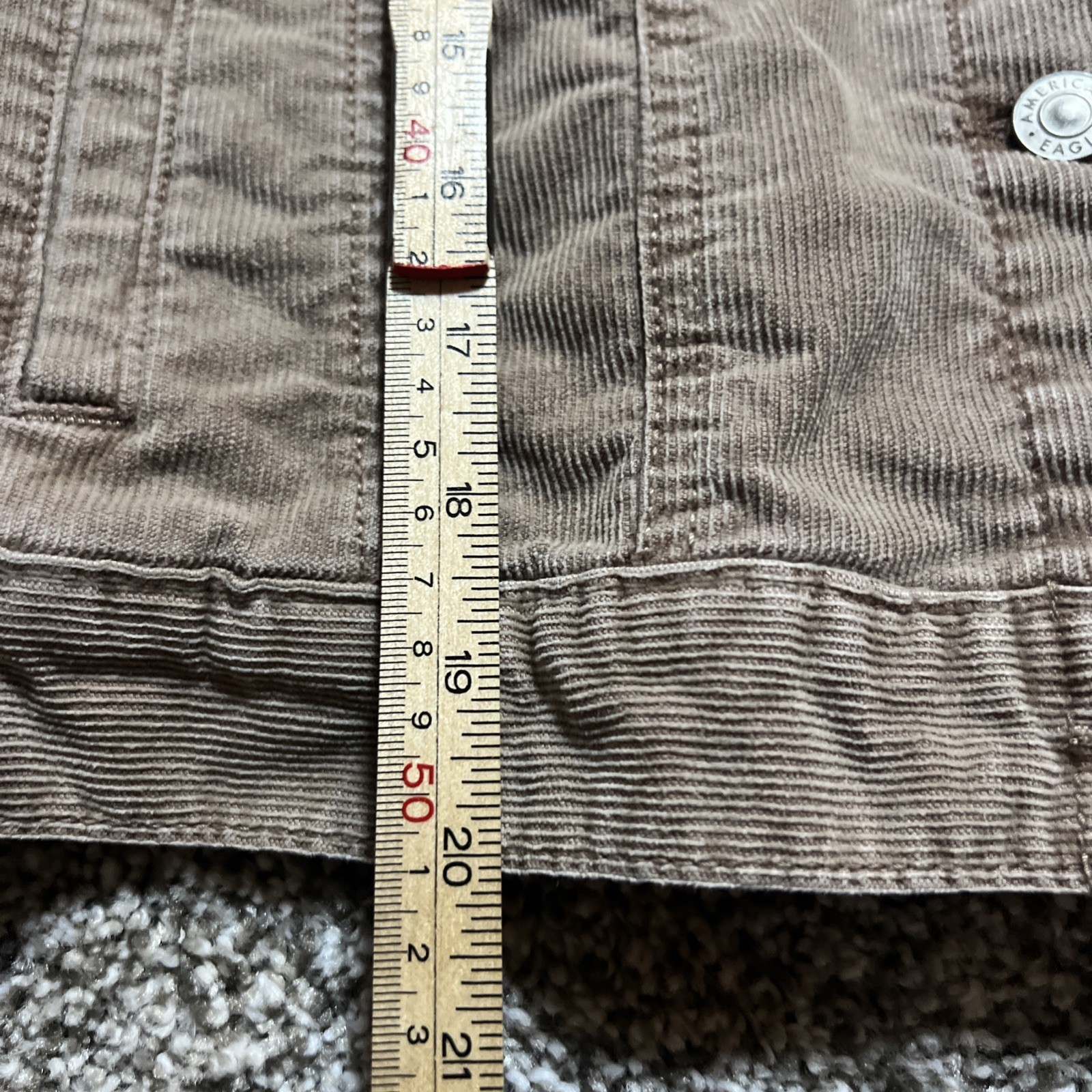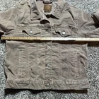 • Style: Corduroy trucker jacket • Color: Brown • Closure: Full button front • Pockets: Two chest flap pockets with button closure, two side welt pockets • Collar: Spread collar • Sleeve: Long sleeves with button cuffs • Material: Soft cotton corduroy • Approx. length (shoulder to hem): About 22 inches (per ruler in photo) • Season: Fall, Winter, early Spring Condition: Pre-owned, good condition – no rips, or major signs of wear. Small white spot on the back of jacket. Se photos