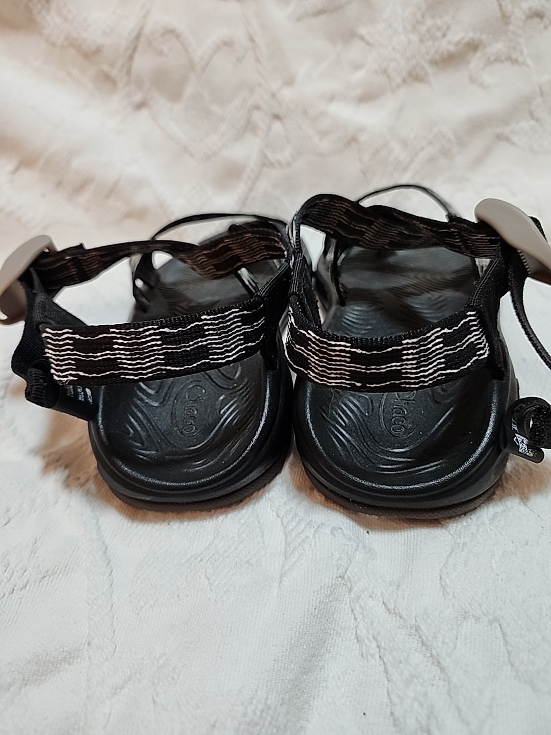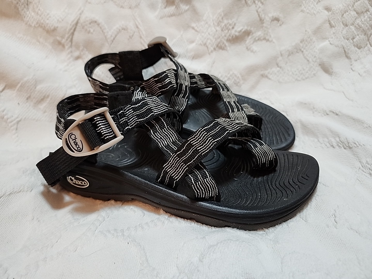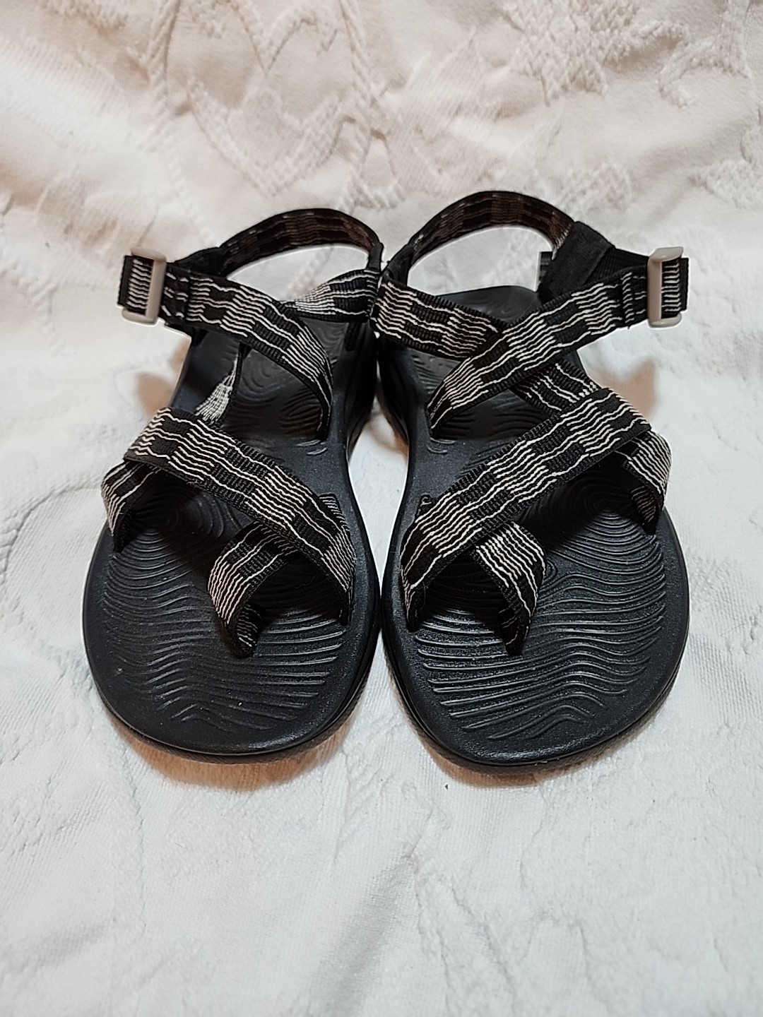 Excellent condition womens chaco z2 classic strappy adjustable hiking sandals or water shoes. Size 6, black with white design on straps. Good tread, no flaws.