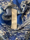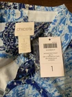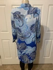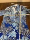 This women's Chico's blouse in size 1 features an enchanting paisley pattern in blue, perfect for travel, casual outings, or business settings. The long sleeve tunic style with a collared neckline and button front closure offers a stylish and versatile look for winter, fall, or spring. Made of polyester material with a woven fabric type, this machine washable blouse from Mexico is designed for a regular fit and is a non-vintage piece. Perfect for those looking for a chic and comfortable top with a touch of sophistication.