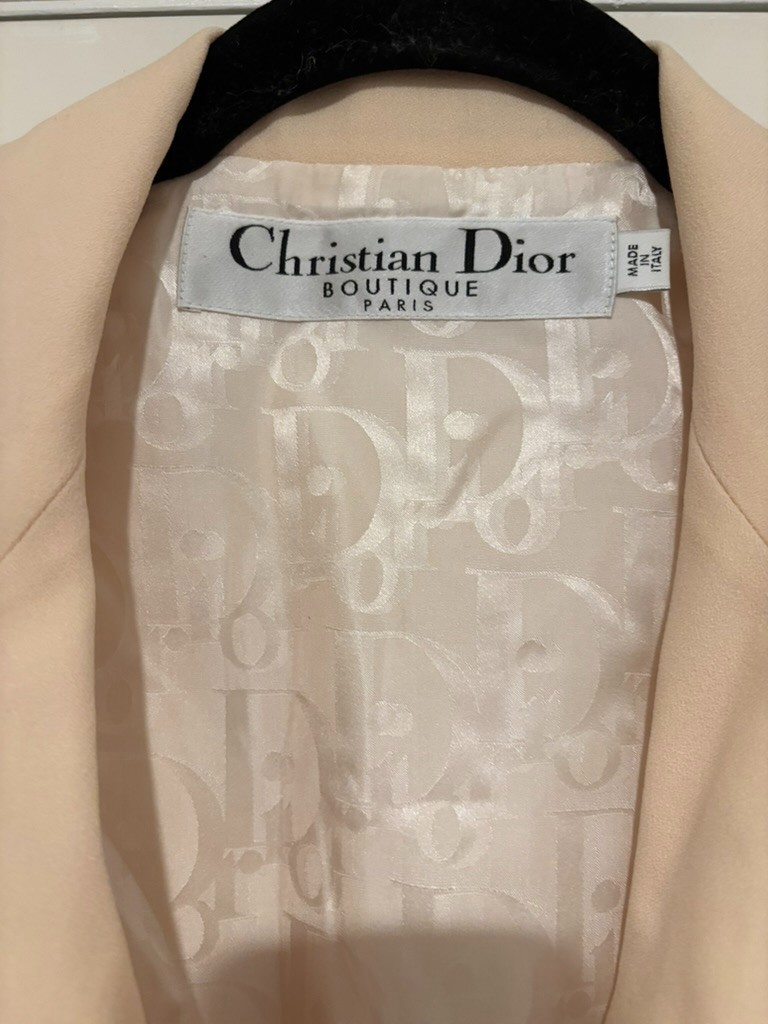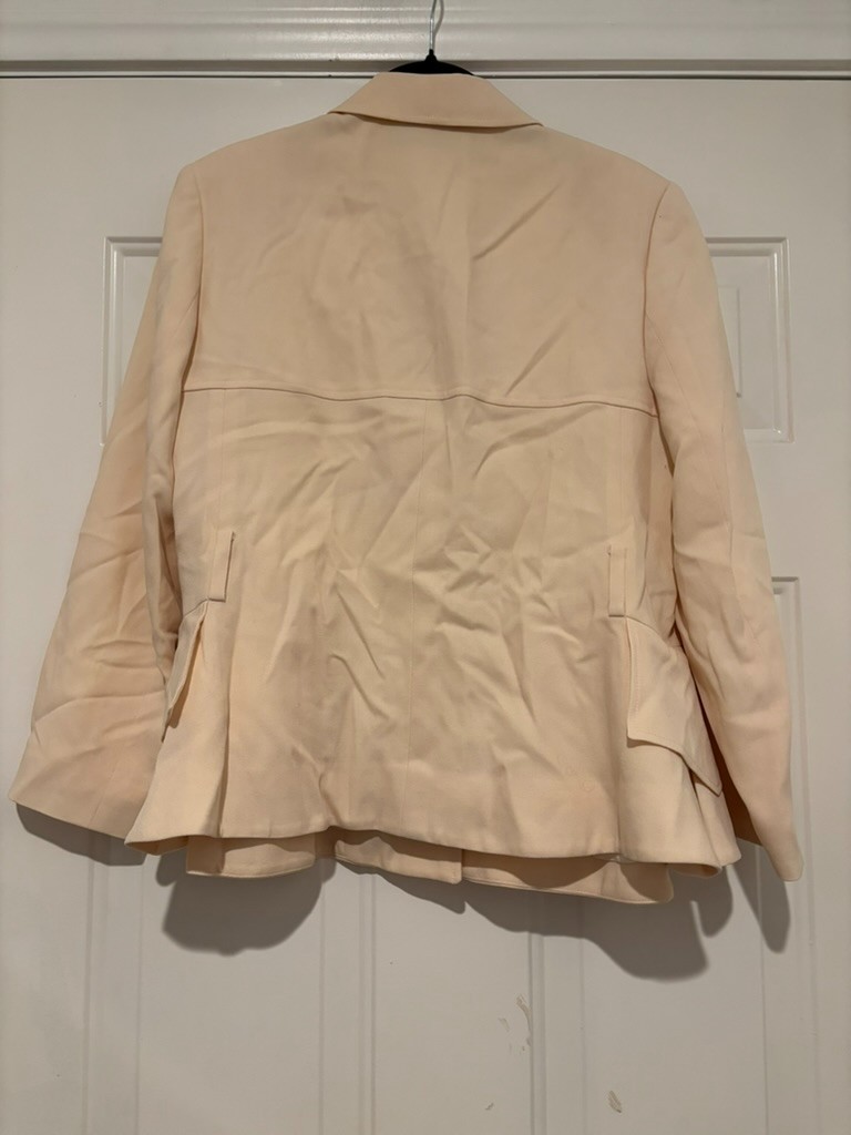 Women's Christian Dior Ivory jacket sz 8 #203. Classy and elegant jacket. Ruffle on each side of the hip. I believe their was a belt that was originally with it because is has belt loops, but I do not have the belt. There is one snap for closure on the front. Shoulders are lightly padded. The pit to pit is 21 inches.