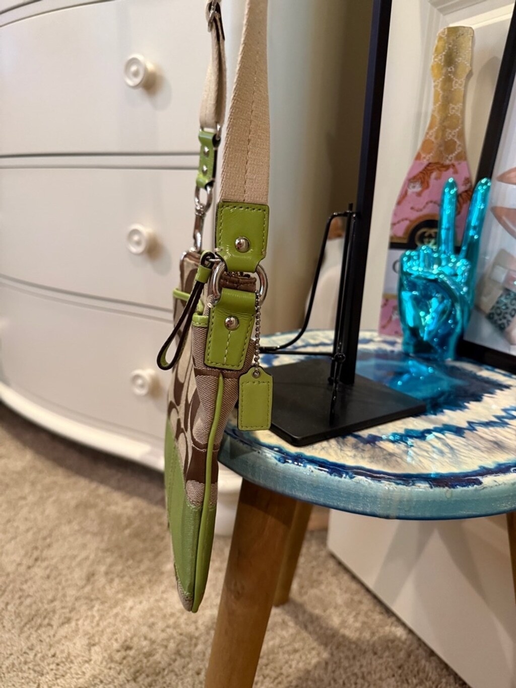 Just got this pre-owned Coach crossbody and I'm obsessed! The brown and beige pattern with that pop of green is so chic. It's the perfect size for essentials, looks brand new, and the adjustable strap makes it super comfortable. Such a great find!