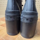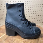 The product is a pair of Converse Chuck 70 De Luxe Heel black leather boots in women's size 9.5. These platform style shoes feature a colorful character with a leather upper material. The Converse brand is known for its quality and these boots are part of the Converse Chuck product line. The boots are not customized and are a stylish addition to any woman's athletic shoe collection.