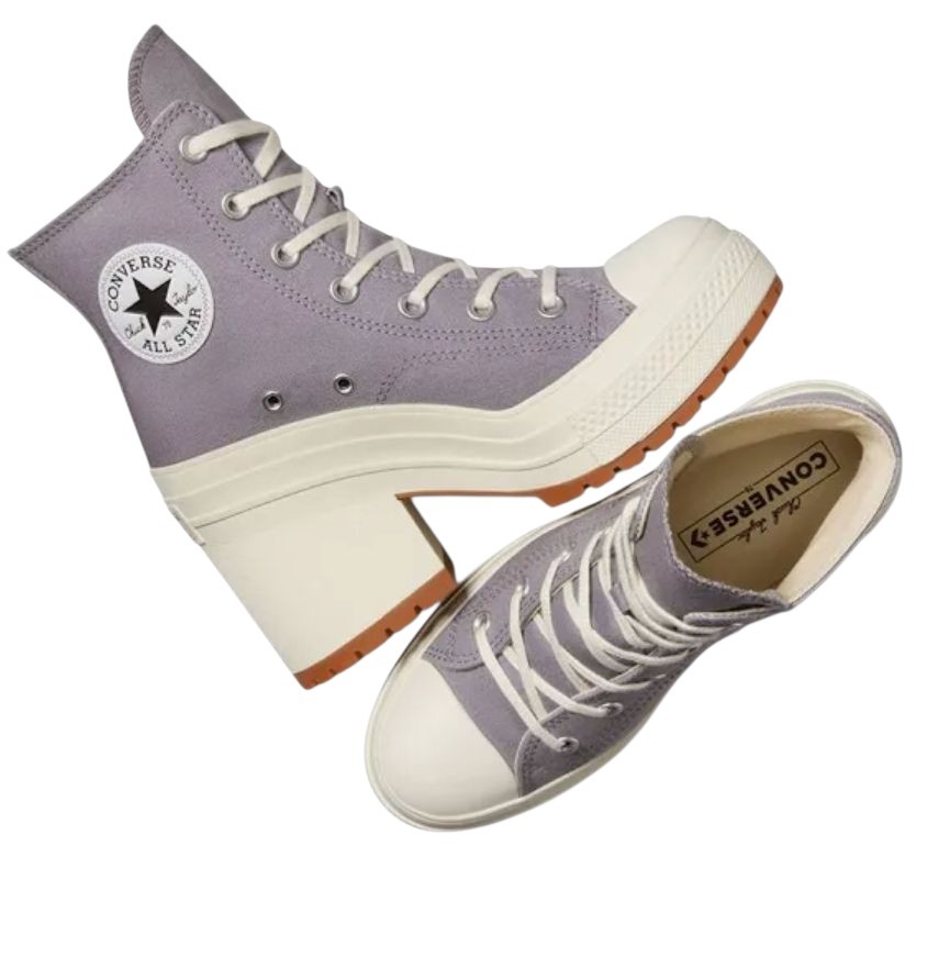 The product is a pair of Converse Women's Chuck 70 De Luxe Heels Shoes in Mauve Stone, featuring a lace-up closure and a rubber outsole. These sneakers have a vintage style with stone accents, perfect for activewear, casual outings, or workwear. With cushioned and comfortable features, these shoes are ideal for summer and spring seasons. The classic Converse Chuck 70 model in size W8 is a versatile choice for various athletic activities like tennis, golf, and basketball, making it a stylish and functional addition to any woman's wardrobe.