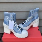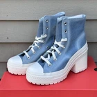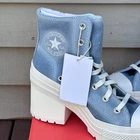 For Sale is a pair of Converse Womens Chuck 70 De Luxe Heel Sneakers Size 7 Washed Blue Denim Platform Shoes New in box. Heeled Chucks Your Jeans Will Envy Inspired by your favorite jeans, the De Luxe Heel gets a fresh look. We traded classic canvas for distressed denim—with acid-wash details for an irresistible vintage edge. Distressed denim upper provides a vintage look and durable feel OrthoLite cushioning helps provide optimal comfort Lugged sole helps provide optimal grip Chunky platform heel ups the height Embroidered Chuck Taylor patch reps the Converse legacy SKU: A12042C Ships same or next day. Any Questions. Just Ask. **Please see all pictures for full item condition and details.** 6082-CONV-B25545665