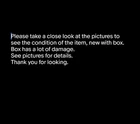 Please take a close look at the pictures to see the condition of the item, new with box. Box has a lot of damage. See pictures for details. Thank you for looking.