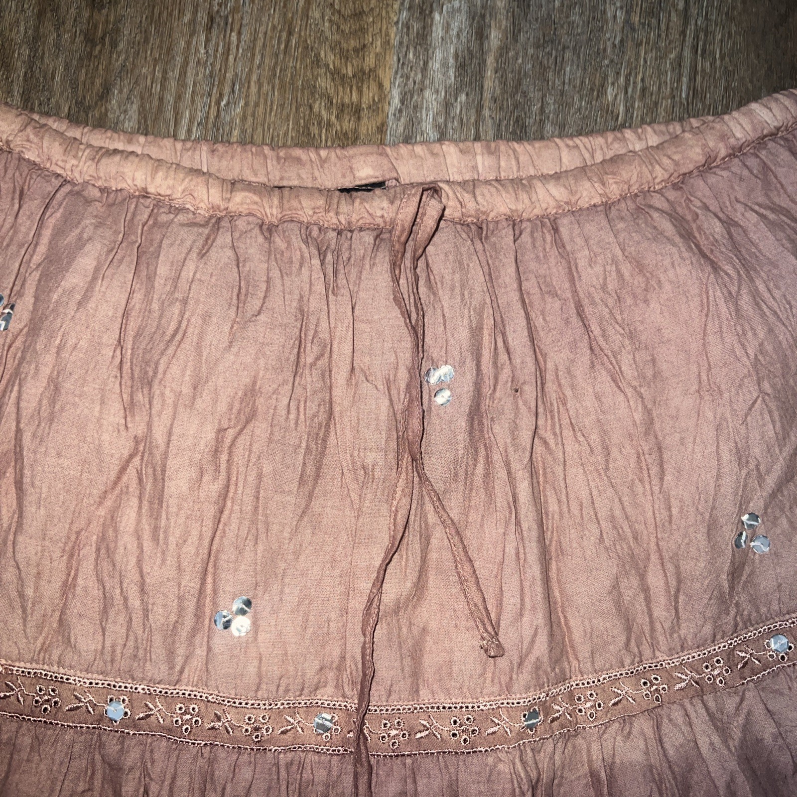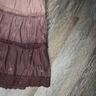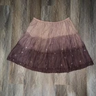 Length: 24” Waist: 18-20” Skirt: Free/31-32” This women's L ombré dye cotton tiered skirt by Angie is adorned with hand bead sequin embroidery and a drawstring waist for customizable fit. The vintage-inspired bohemian style makes it suitable for both party and casual occasions, with a knee-length design perfect for the summer, fall, and spring seasons. Made in India, the lightweight and lined skirt in brown color offers a full look with accents of sequins, adding a touch of sparkle to your wardrobe.
