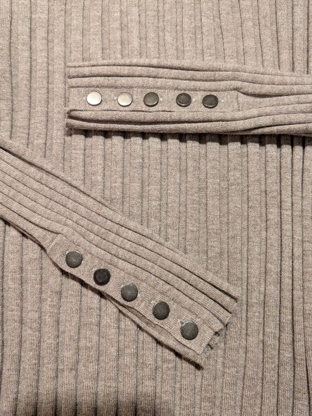 This pre-owned Cyrus brand topis a size Large. It features a ribbed knit construction in a light brown or taupe color. The long sleeves have decorative silver-toned buttons at the cuffs. It has a crew neckline and a fitted silhouette. There are no visible signs of imperfections. It's stretchy Length: 25"