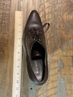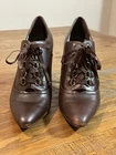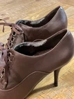 Dark brown lace-up ankle boots with a pointed toe and high heel. These stylish boots feature decorative grommets and ribbon lacing for a fashionable detail. The sleek silhouette and rich brown hue make them a versatile addition to any wardrobe. Measurements: • Heel Height: 4 in Department: Women Upper Material: Leather Heel Style: Stiletto Type: Heel Toe Shape: Pointed Toe Pattern: Solid Heel Height: High (3-3.9 in) Closure: Lace Up Features: Lined Insole Material: Leather Outsole Material: Leather Lining Material: Leather Shoe Width: Standard Accents: Eyelet, Bow Keywords: ankle boots, lace up shoes, high heels, pointed toe, fashion boots, dress boots, dark brown, women's fashion, footwear, heeled boots, stylish shoes, booties Condition: Excellent. No rips, holes or stains. Measurements: Please compare measurements to something you already own and love. Shipping: We ship all items within two business days.