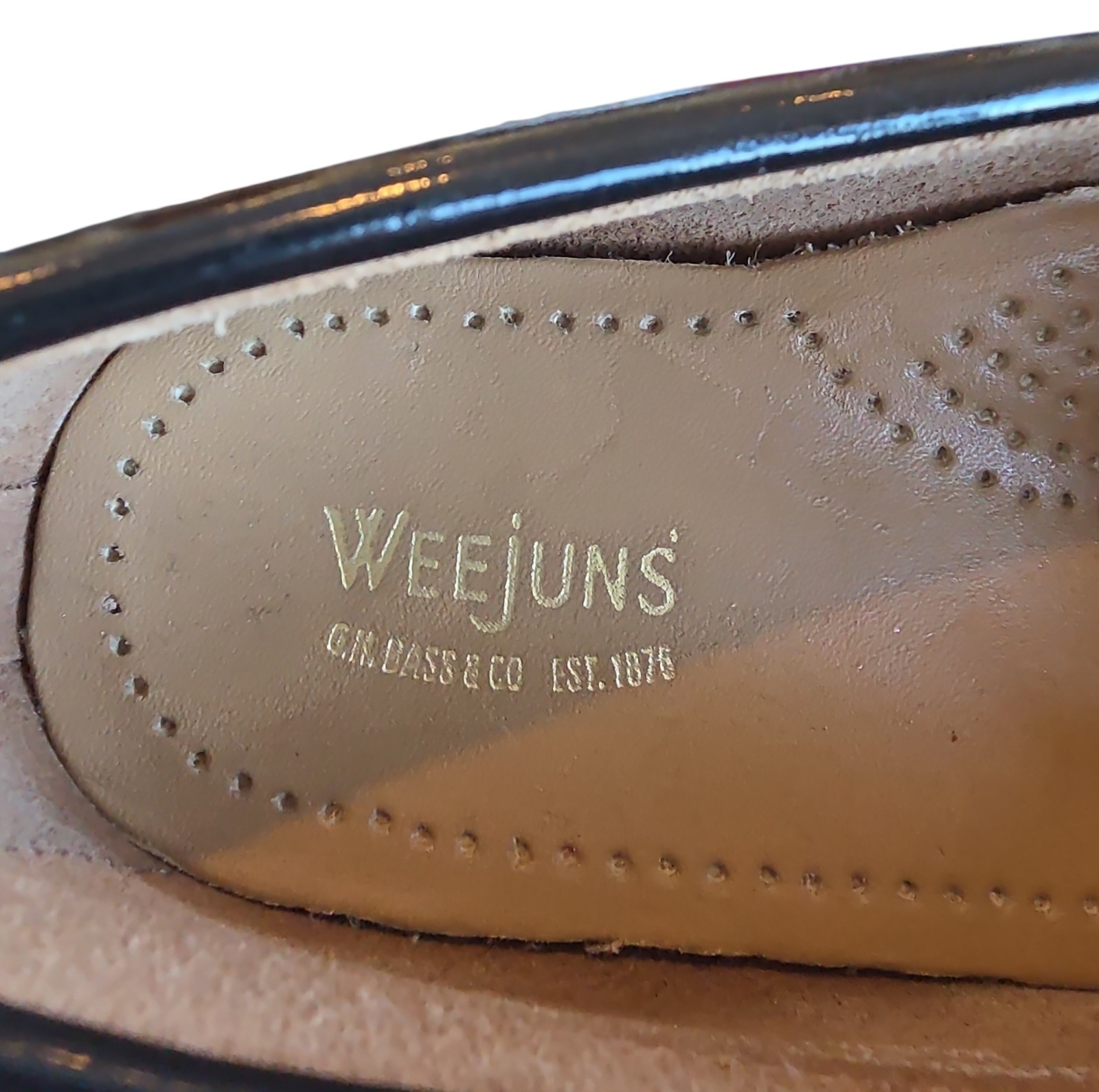 Y2K wardrobe staple at its finest! Glossy black patent leather, preppy slip on style loafers with classic stitched detailing. In very good vintahe condition with light surface creasing consistent with age and wear.