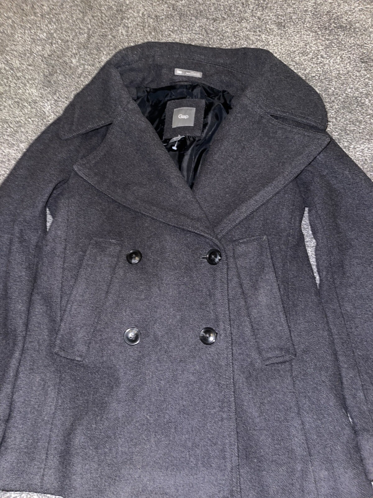 Upgrade your winter wardrobe with this stylish grey Gap jacket. Crafted from a cosy wool blend, this short-length overcoat features a button closure and a classic fit that flatters your figure. Ideal for women who love to stay warm in style, this jacket is perfect for any occasion, be it a day out with friends or a formal office look. The jacket is available in size XS and comes with a polyester lining that adds extra warmth and comfort. With its timeless design and superior quality, this Gap jacket is a must-have for any fashion-savvy woman who wants to stay ahead of the winter chill.
