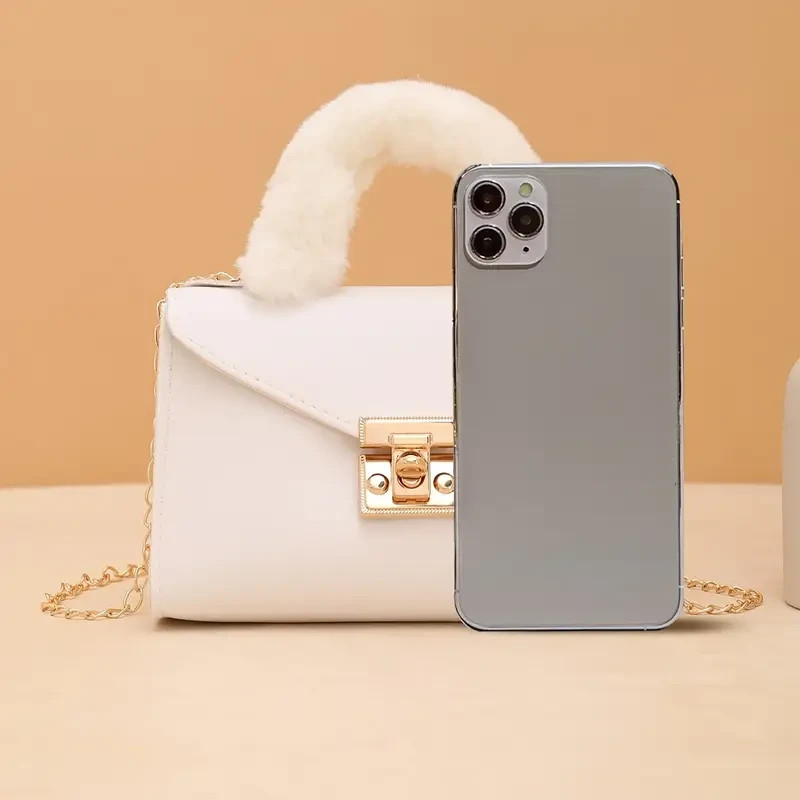 This stylish Soft Plush Faux Fur women's handbag features a solid white exterior with a soft faux fur material. It includes a detachable chain strap and wrist lock closure, making it convenient and secure. The white handle/strap colour adds a chic touch to the overall design, making it a must-have accessory for women looking to elevate their outfit.
