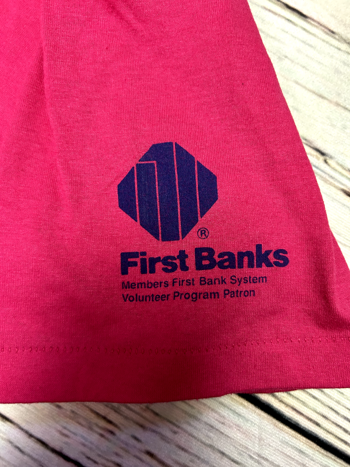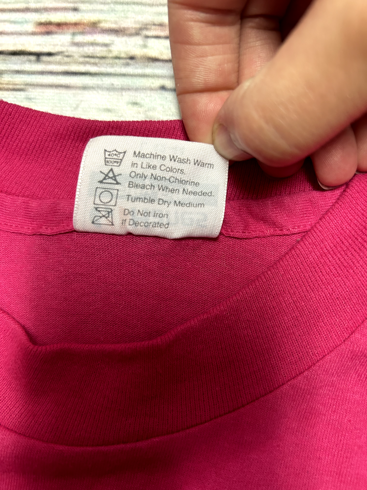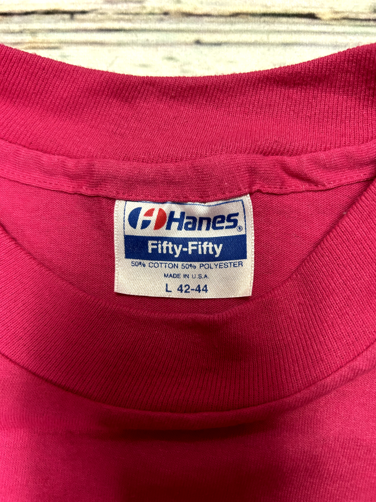This Hanes T-shirt is a unique piece from the U.S. Olympic Festival Volunteer collection. It features a crew neck and short sleeves, with a comfortable regular fit. The graphic print on the pink fabric showcases a USA theme, perfect for any patriotic occasion. Made in the United States with a blend of polyester and cotton, this T-shirt is machine washable for easy care. It is a size L and suitable for men who love to wear comfortable and stylish clothing. Get your hands on this one-of-a-kind piece today!