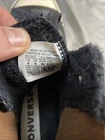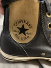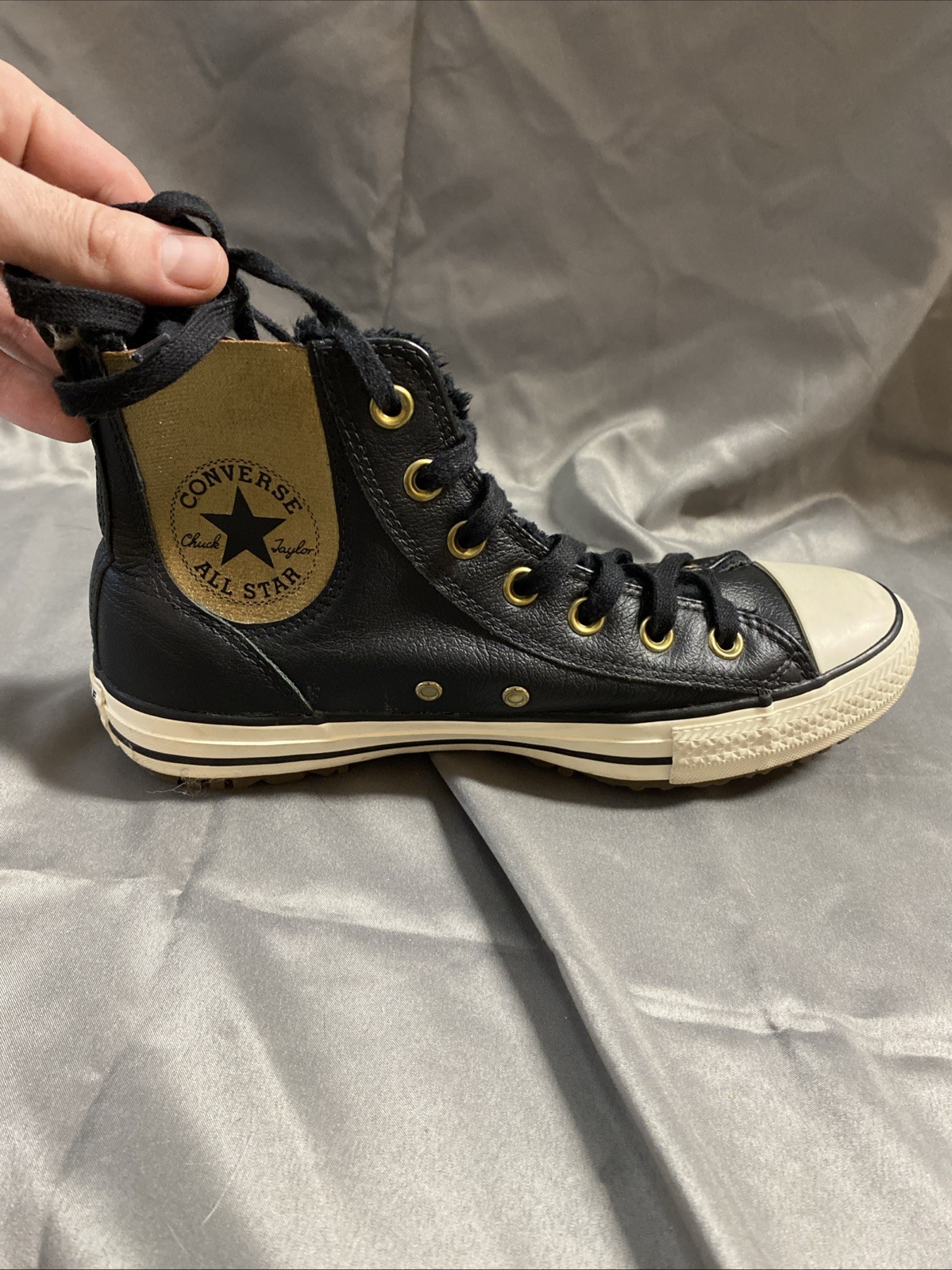 The product is a women's high top Chuck Taylor Converse shoe in black leather with gold accents and fur lining. It features a lace-up closure, rubber outsole, and is designed for casual occasions. The shoe is not signed and has a standard shoe width. The brand is Converse, and the model is the Chuck Taylor All Star. This sneaker is ideal for walking and is perfect for the summer and spring seasons.