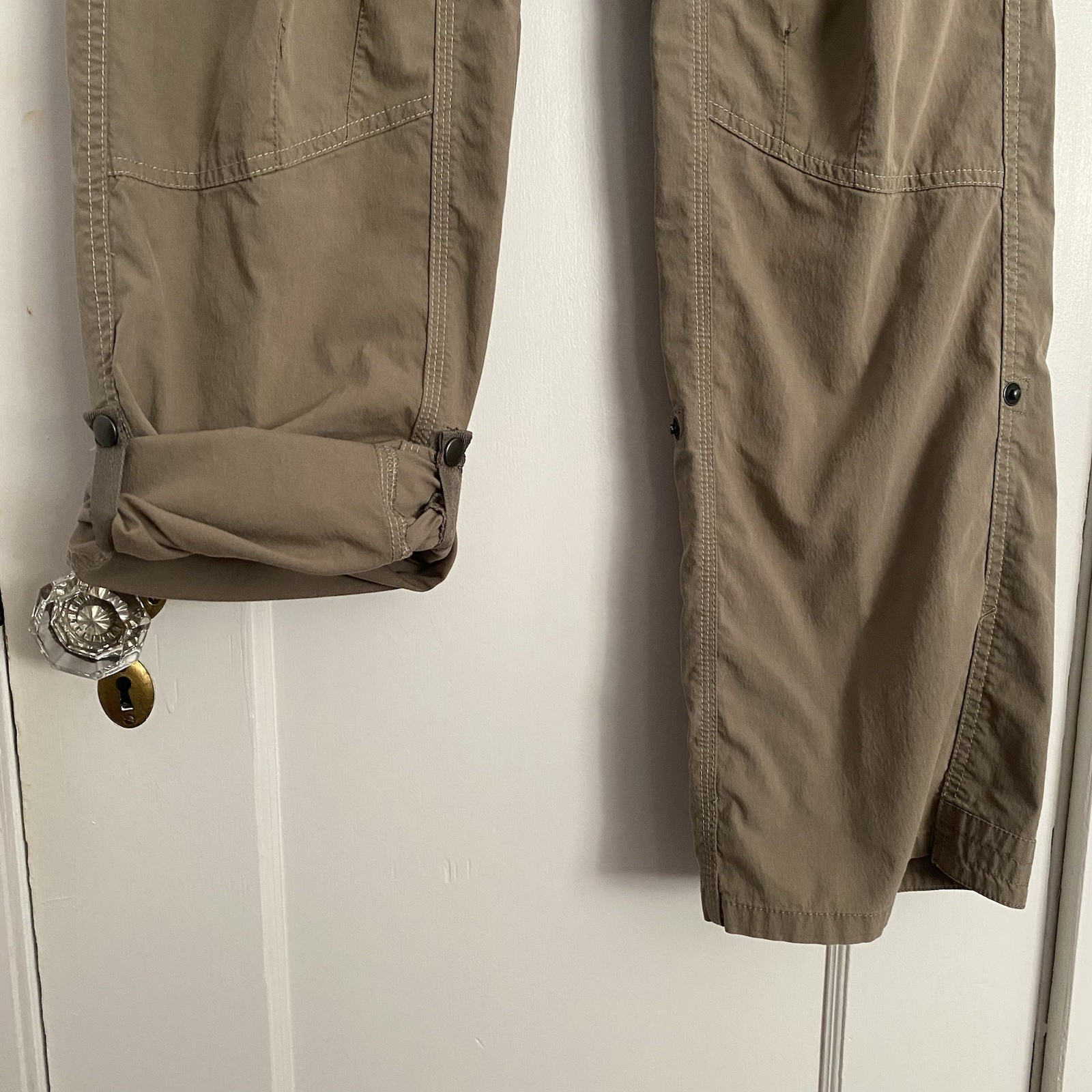 The Women’s Kuhl Legendary Pants in khaki, size 10 Long, are ideal for outdoor activities like hiking and casual wear. Made from a lightweight cotton blend material, they offer comfort and flexibility. The solid beige color and straight leg style make them perfect for blending in with nature while traveling. With a zip and button closure, these pants provide a secure fit for the adventurous woman on the go. Approximate Measurements: 16” across waist 32.5” inseam 9” rise In excellent pre owned condition