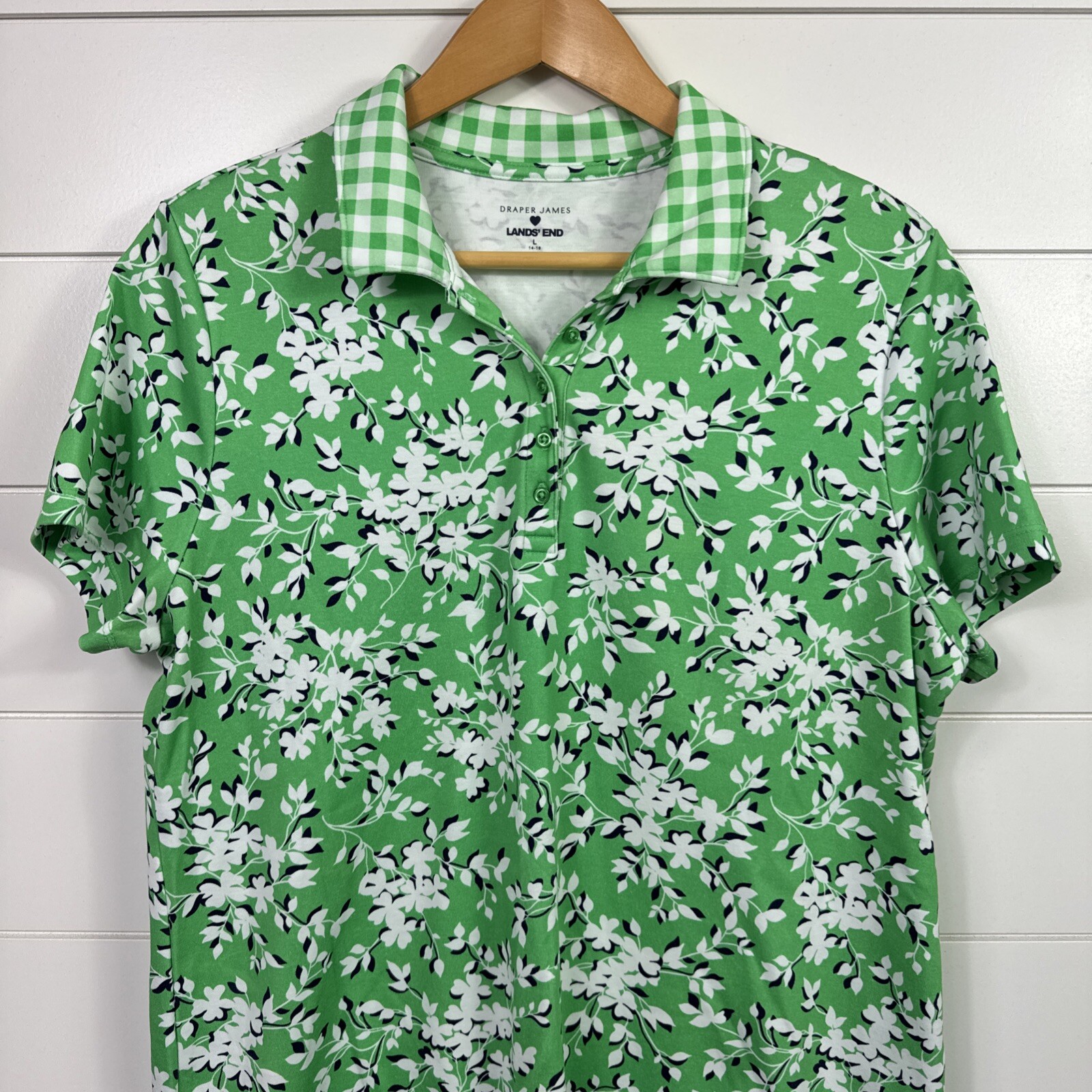 Women's Draper James Lands End Polo Shirt sz Large 14-16 -Style: Polo Shirt -Color: Green with navy blue/white floral print with green/white checked collar -Pullover style with 5 button front closure -Collared -Short Sleeved -100% cotton -Excellent condition! Flat Measurements: 21.25" Bust plus stretch 26" Length I take very good care of my items in my smoke free home! If you have any questions, please contact me and I'll be more happy to answer! Please check out my other listings and Thanks for looking!