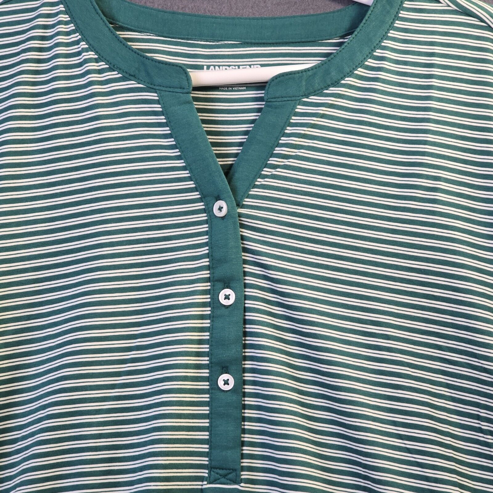 This Lands' End top is a women's green Henley shirt in size large striped pattern and long sleeves. Made from a blend of Spandex, Cotton, and Modal, this T-shirt offers a comfortable and stretchy fit. It is designed for casual occasions and features a pullover closure. The classic yet modern style, along with the breathable material, makes it suitable for wearing in all seasons.