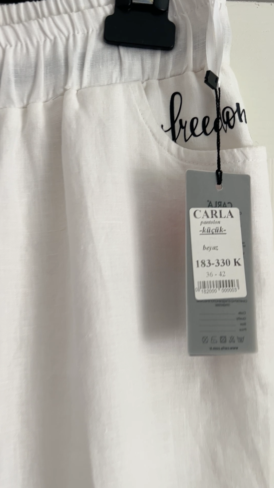 The Women's Summer Pants by Carla are made in Turkey and are perfect for the warmer months. With a wide-leg and loose fit, these pants are comfortable and stylish. The drawstring closure adds a customizable touch, while the solid white color is versatile for various occasions such as travel, parties, casual outings, and workwear. Crafted from a blend of cotton and linen, these pants have a chic palazzo style that is flattering and easy to wear.