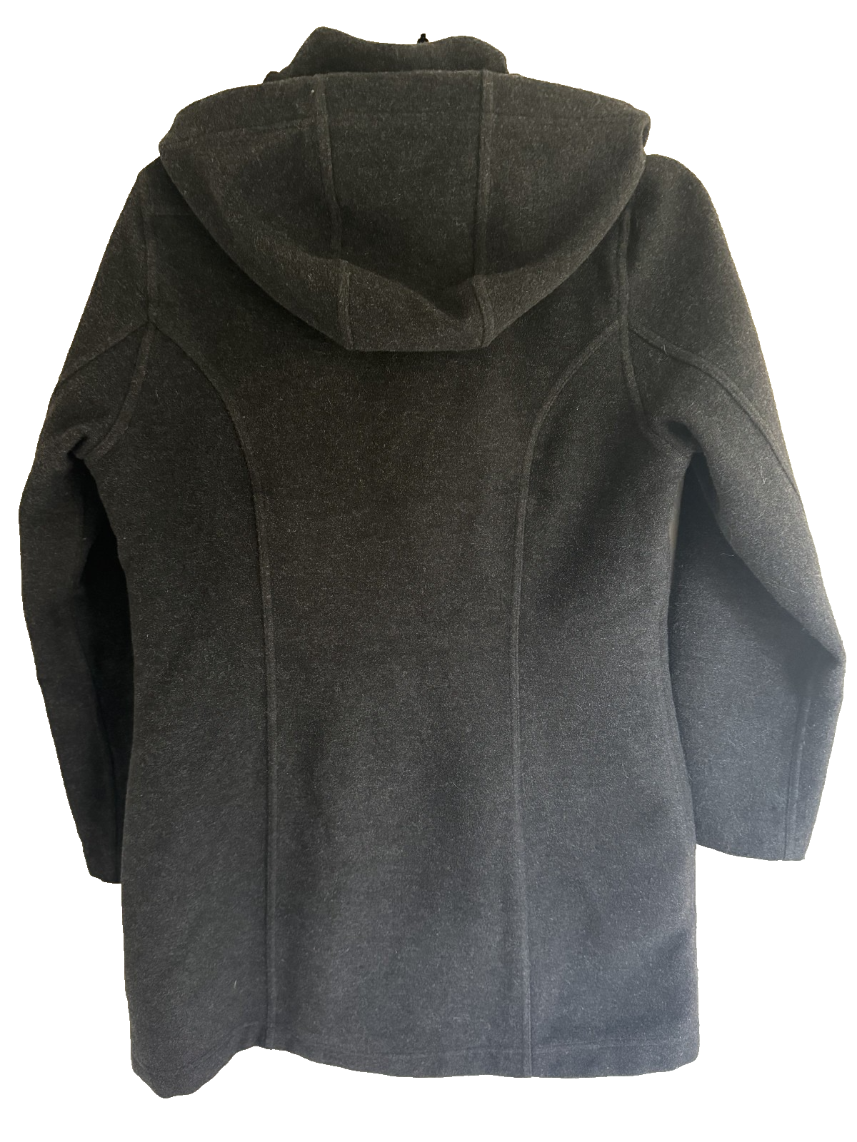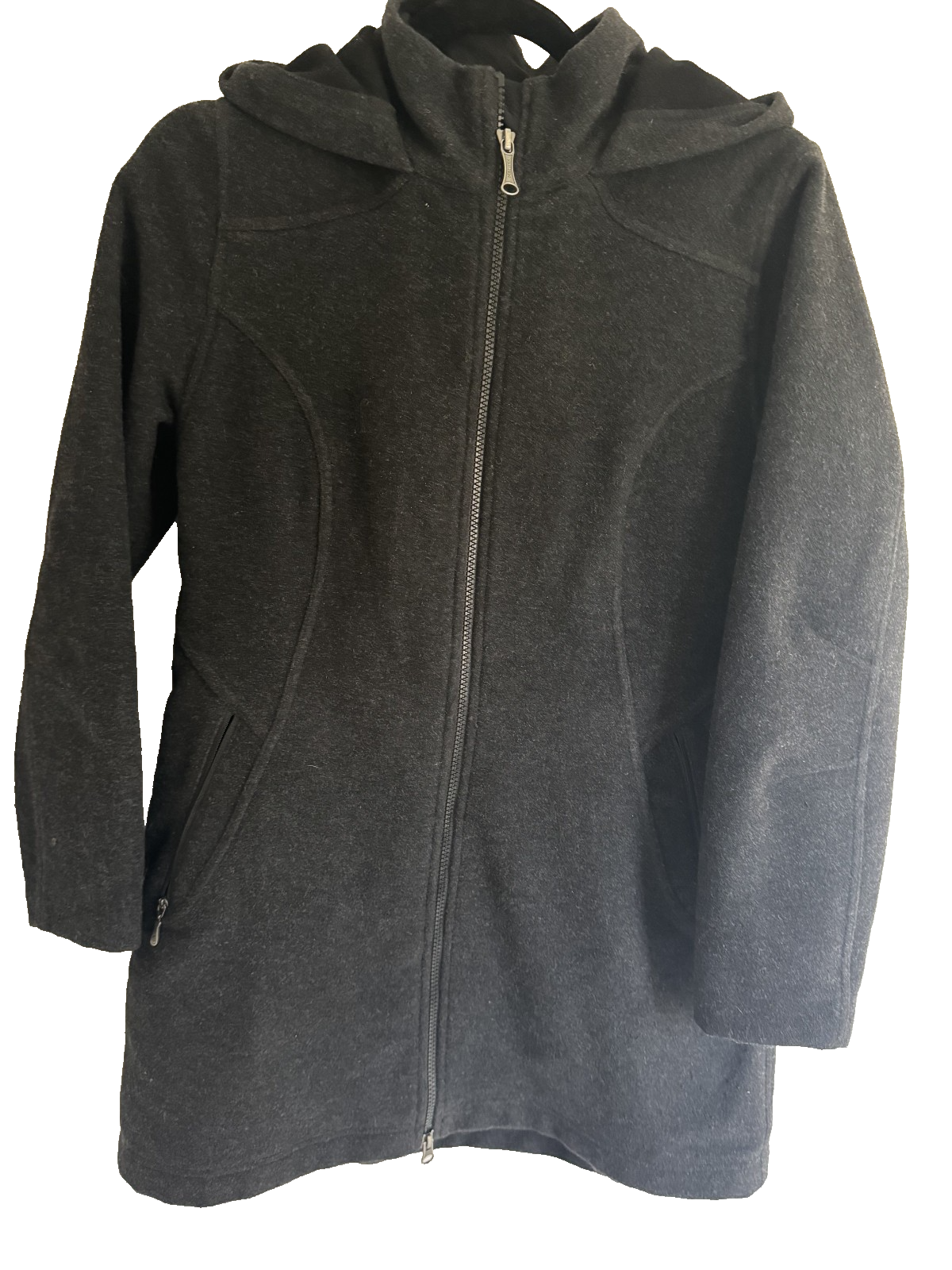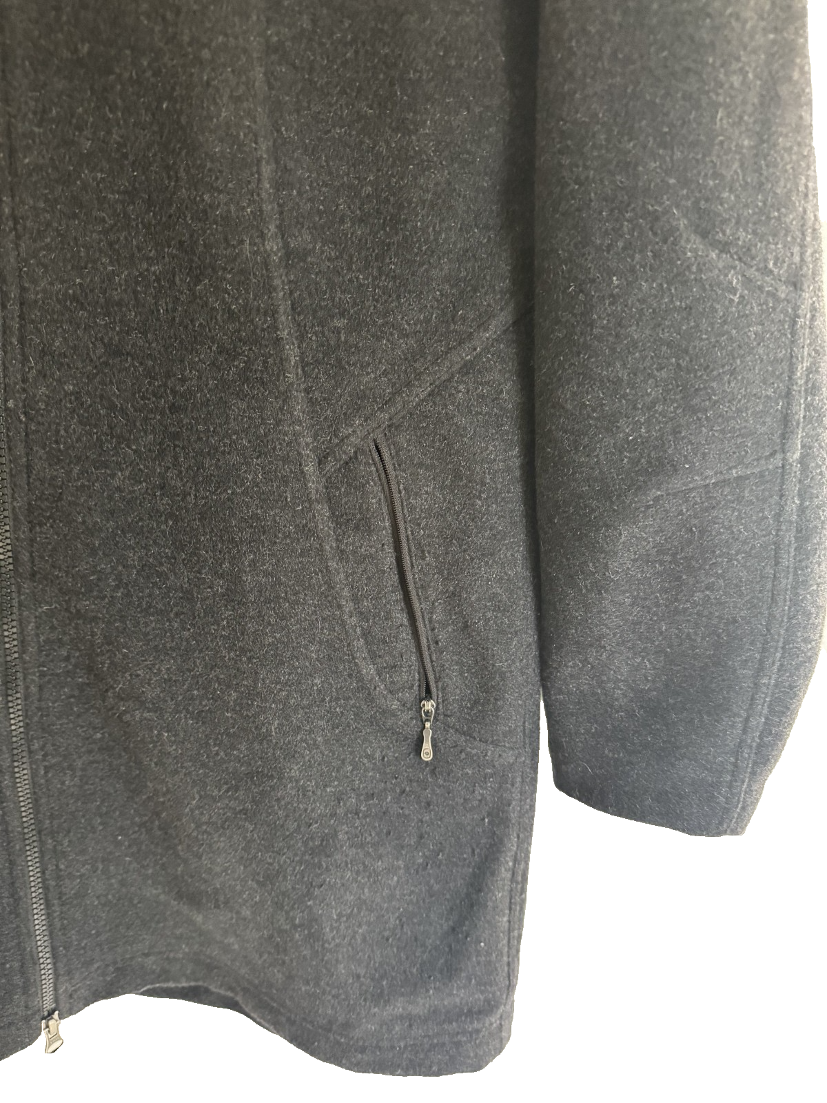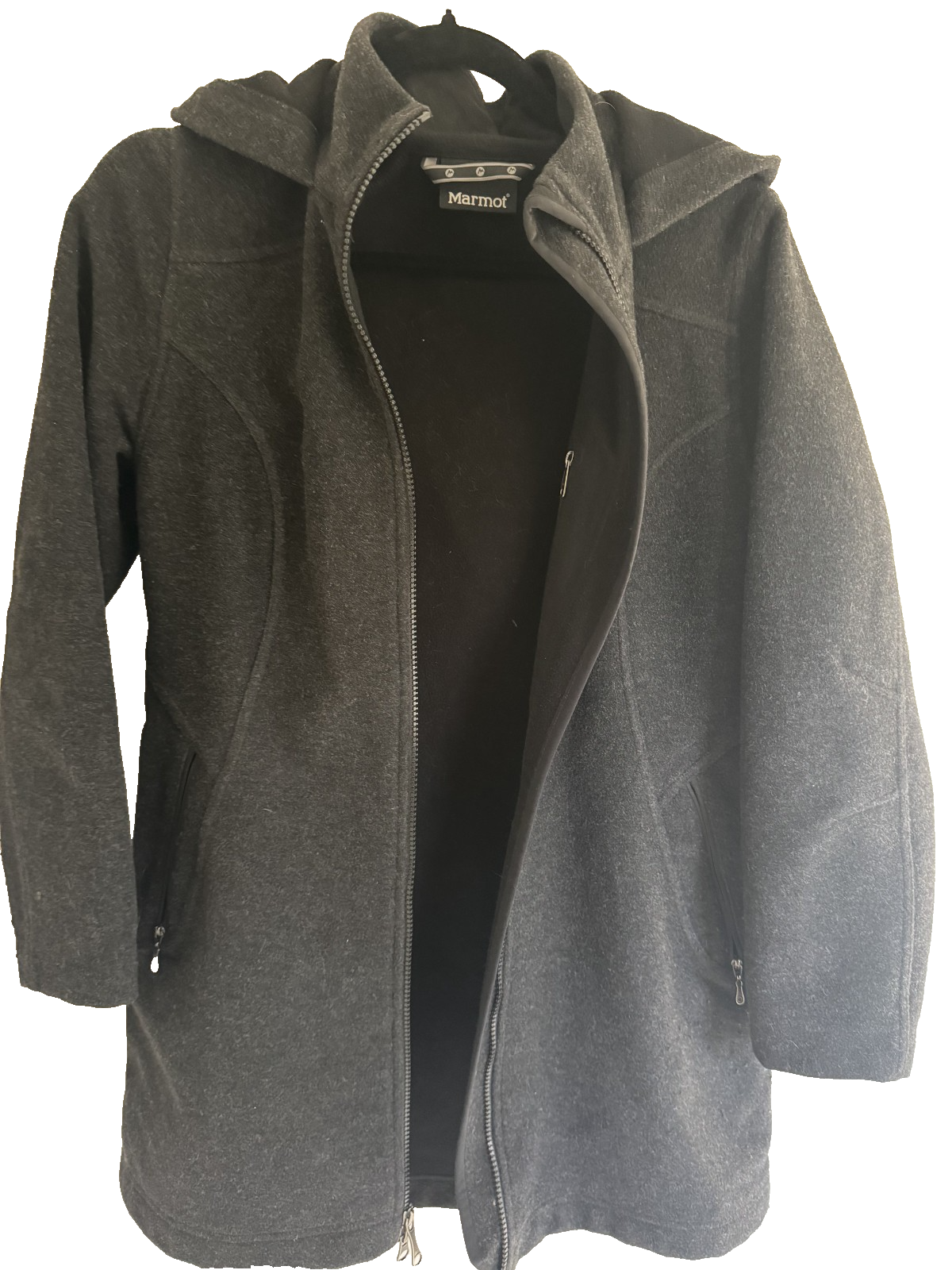 This Women's Marmot Wool Coat with Fleece Lining and Full Zip is a stylish and functional outerwear option. With a cozy fleece lining, this jacket is perfect for cold weather. The long length, full zip closure, and hooded design make it ideal for casual occasions and outdoor activities. Solid charcoal grey color and parka style with zippered pockets. Made by the reputable brand Marmot, this jacket is an outdoor essential. Pit to Pit 20 inches Sleeve Length 23 inches Overall Length is 31 inches