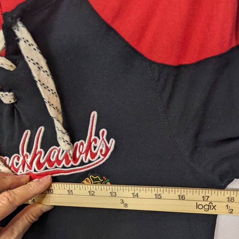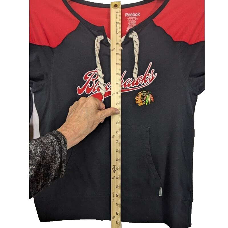 Reebok Chicago Blackhawks Pullover Shirt Jersey Womens NHL Long Sleeve Black & Red Style 3266W 11 Tie at Neck Kangaroo Pocket Size Medium 60% Cotton 40% Polyester Machine Wash Tumble Dry Pit to Pit 18" Length 23" Sleeve 20.5" All measurements are approximate and done with garment laid flat No tears, stains or holes Fast Shipping!