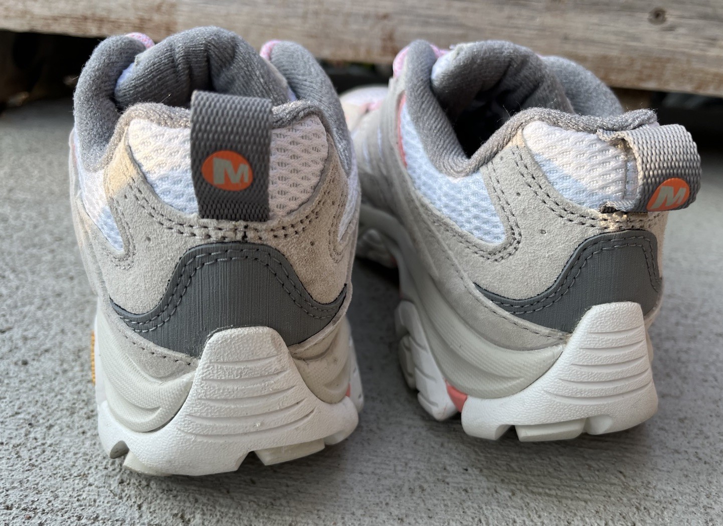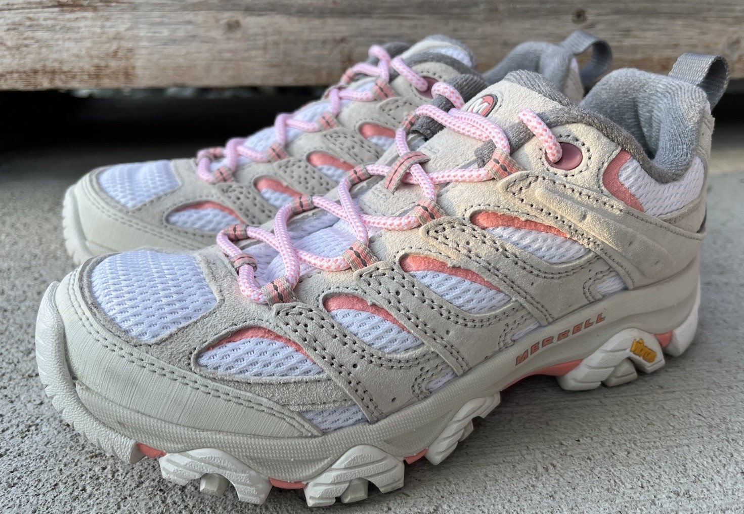 Merrell Moab 3 Women’s size 6 Hiking Shoes Vibram outer soles White/Soft Coral Great pre-owned condition - some surface dirt on outer soles
