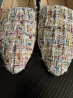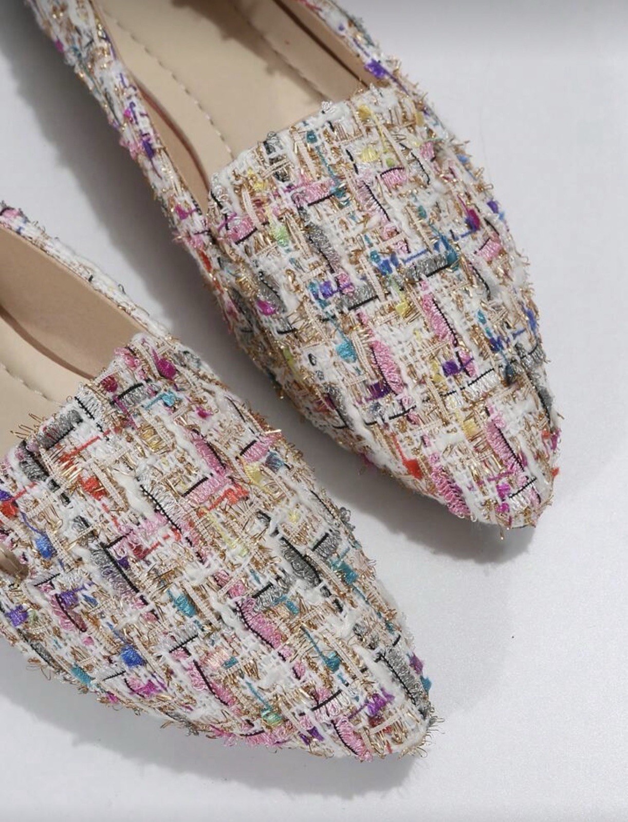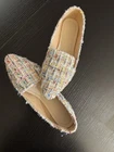 Step into chic comfort with these multicolor tweed loafers. Designed with a pointed toe and slip-on style, these flats combine elegance with everyday wearability. The woven tweed fabric features vibrant threads of pink, blue, gold, and white, giving a stylish, textured look that pairs beautifully with jeans, skirts, or dresses. Perfect for both casual outings and polished ensembles. • Size: EU 42 (fits US Women’s 9.5) • Color/Pattern: Multicolor tweed with metallic accents • Style: Loafers, slip-on flats • Toe Shape: Pointed • Comfortable cushioned insole • Lightweight & versatile design