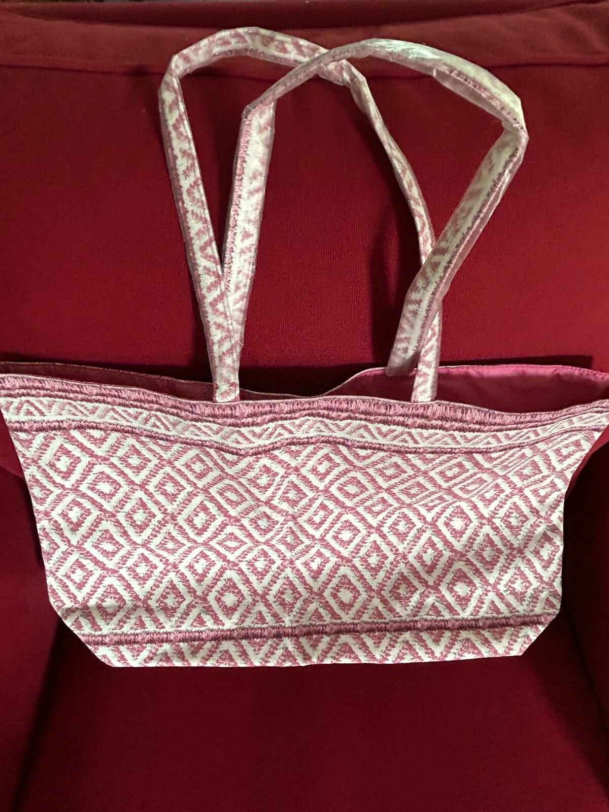 Women’s Nice Large Estée Lauder Tote Bag with Fabric Lining. Dimensions: 4” D x 13” W x 20” W, handles 11” H. Colors mauve and white diamond shape. On 1 side only tassels purple, teal, red, yellow. Fabric 100% cotton outside, satin fabric inside. No closure and tassels look real but are printed in fabric. Made in China and from smoke-free home.