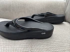 The Women's OOFOS Thong Sandals are in black, size 11, featuring a slip-on style with a solid pattern and logo accents. These comfortable flip-flops are designed for casual wear and are made with a breathable synthetic upper material. The OOFOS sandals are part of the Comfort Plus product line, ideal for providing comfort and support for recovery after physical activity or for everyday use.