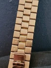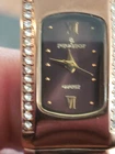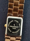 This elegant Women's Peugeot 7040BR watch boasts a stunning design with swaroski crystals and a Swiss movement. The round brown dial is adorned with Roman Numerals and round indexes, while the 12-hour dial features a brown bezel with brown crystals. The watch has a scratch-resistant crystal case material and a snap caseback. The metal bracelet has a brown finish and a push/pull crown, making it easy to adjust. This vintage watch is in excellent working condition and comes with its original box and packaging.