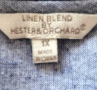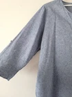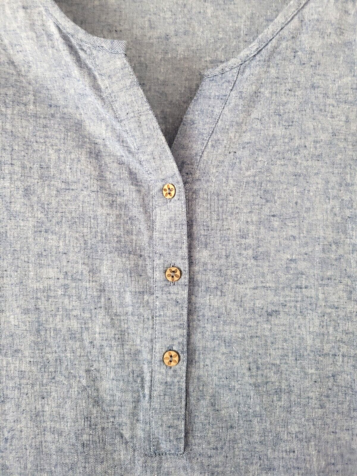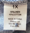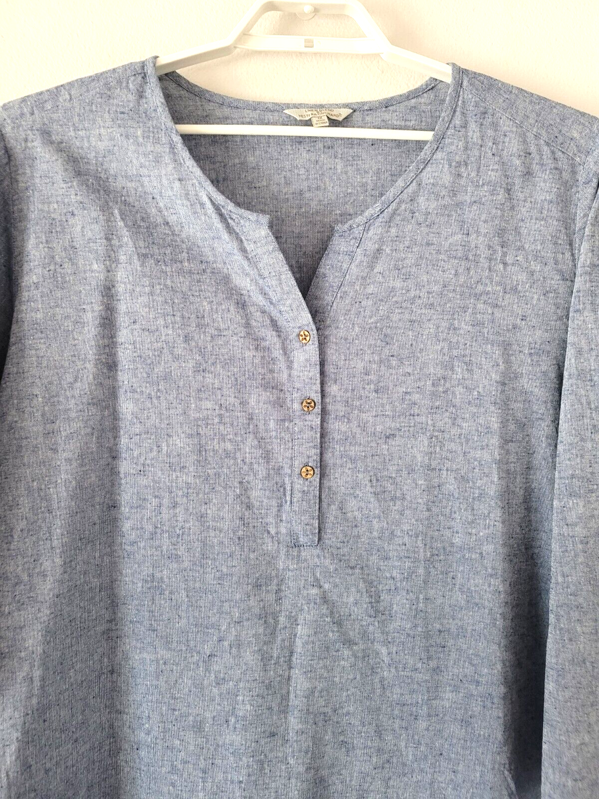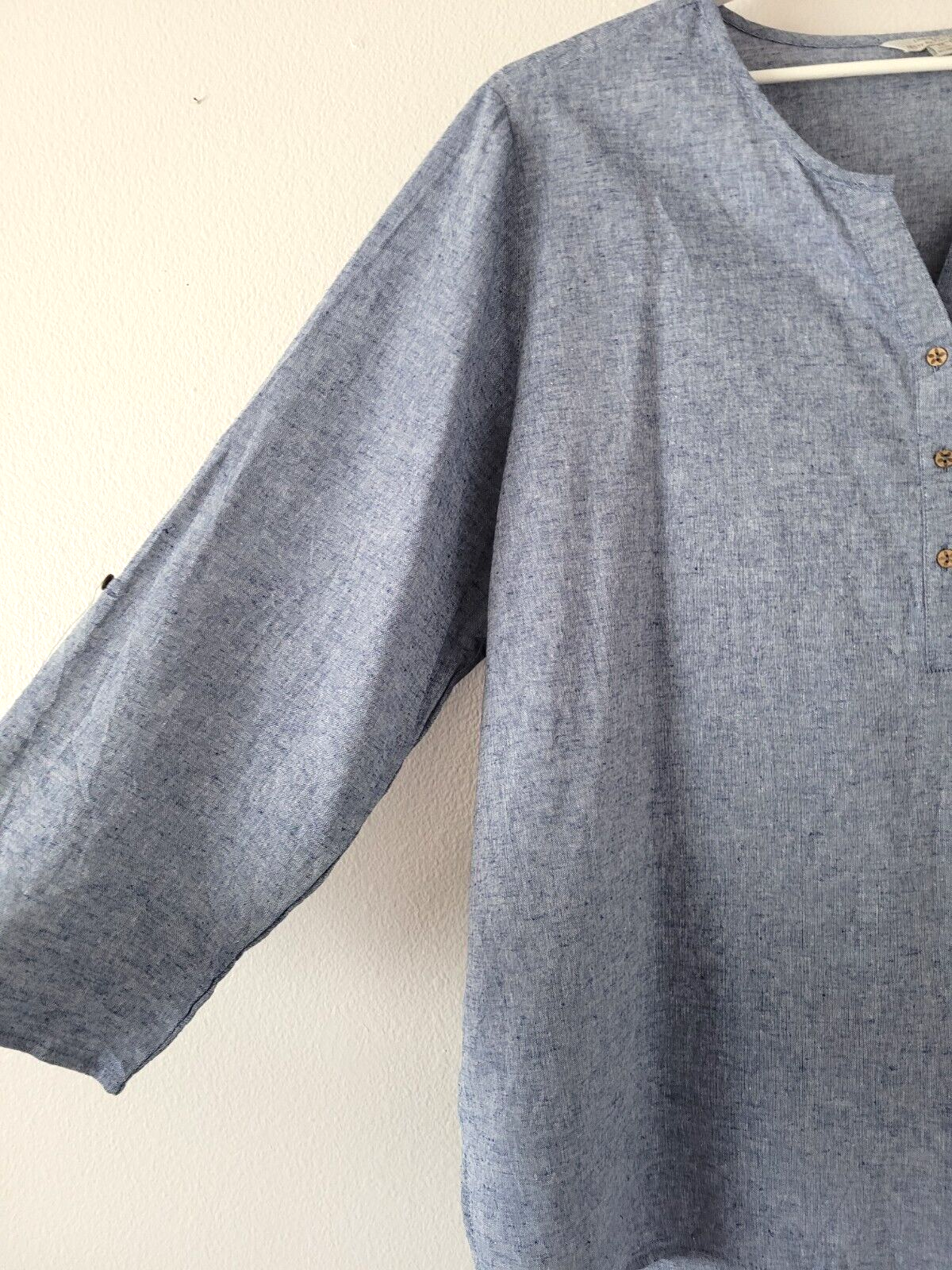Women's Size 1X Linen Cotton Top Half Button Front Tab Long Sleeve Blue Tunic in very nice condition, no holes tears stains, please see photos for further info chest, measured underarm to underarm across front--27" length, measured mid back neckline to hem-- 31"