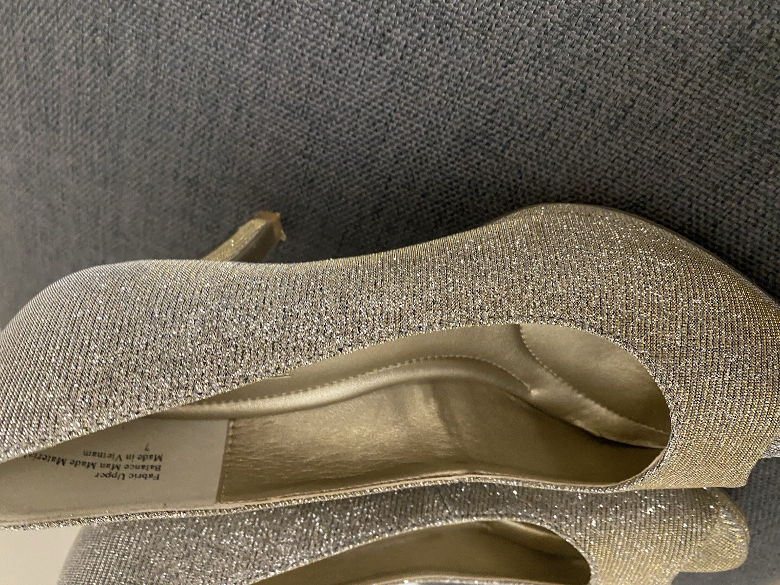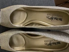The product is a women's Coach and Four open toe pump in size 7, featuring a sparkly gold color and a kitten heel style. Made of synthetic material with a leather lining and insole, this stylish pump is designed for the summer, fall, and spring seasons. The pump exudes a metal theme and a modern pump style, perfect for adding a touch of glamour to any outfit.