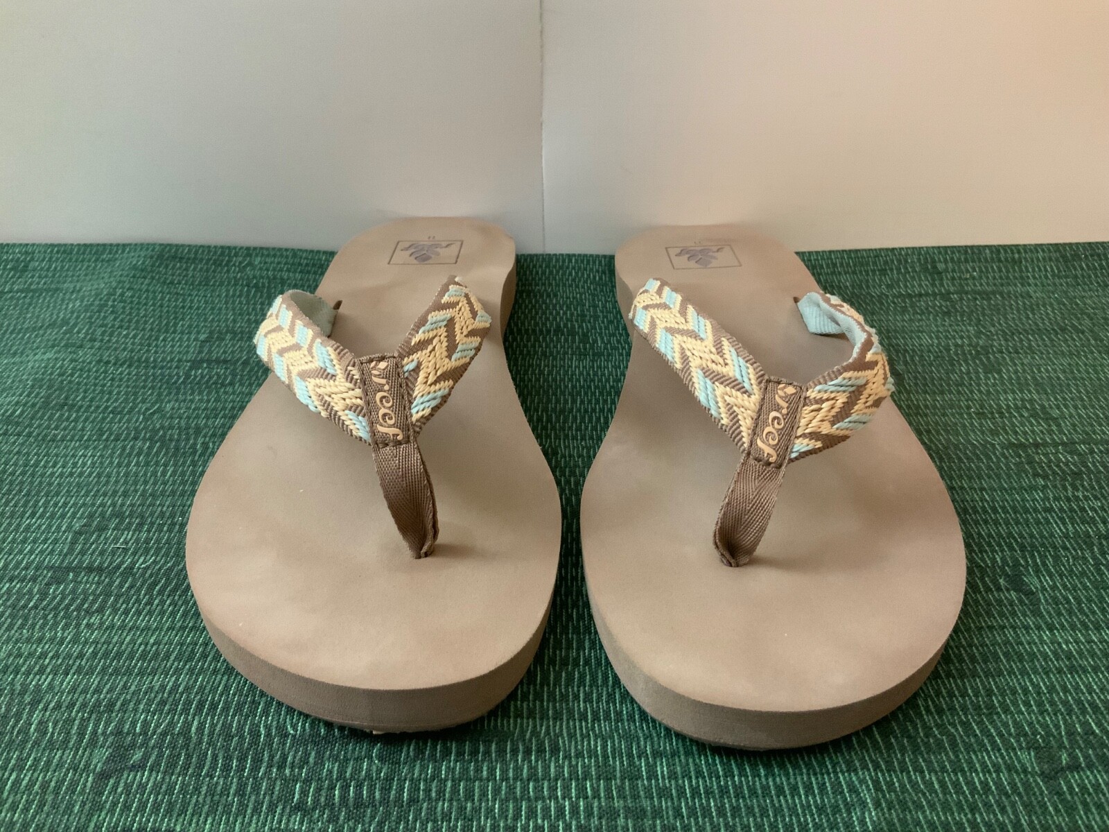The product is a women's Reef flip flop/thong sandal in size 11, featuring a tan woven design with brown and white accents. Made with a cotton blend upper material, this stylish sandal is perfect for beach outings or casual summer wear. The flip flop style offers comfort and ease of wear, making it a versatile and fashionable choice for women looking for a trendy sandal option.