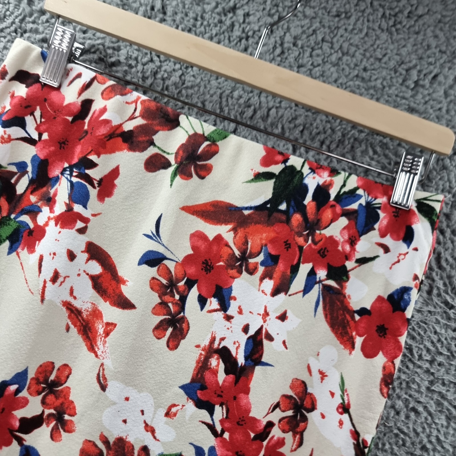 Absolutely love this skirt! The stretchy knit fabric is super comfortable, and the red and cream floral print is gorgeous. Fits perfectly—true to size—and hits just at the knee for a flattering look. Super fast shipping too, which is a huge plus. Highly recommend!
