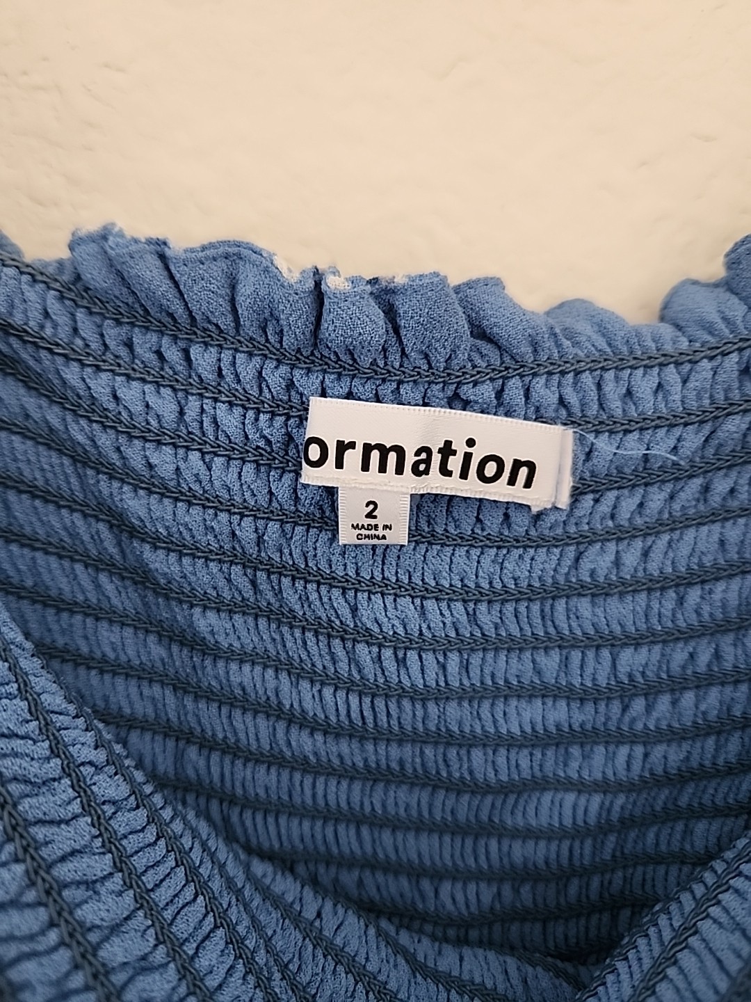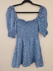 This Women's Reformation blue and white floral smocked mini dress with puff sleeves in size 2 is perfect for various occasions such as travel, party, or casual wear. The dress features a square neckline, short puff sleeves, and a pullover closure. Made from viscose material, it is lightweight, lined, and smocked, making it comfortable for the summer, fall, or spring seasons. The floral pattern and ruffle accents add a touch of charm to this stylish and trendy dress from the Reformation brand.
